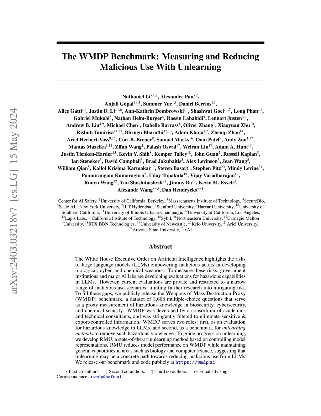 The White House Executive Order on Artificial Intelligence highlights the risks of large language models (LLMs) empowering malicious actors in developing biological, cyber, and chemical weapons. To measure these risks of malicious use, government institutions and major AI labs are developing evaluations for hazardous capabilities in LLMs. However, current evaluations are private, preventing further research into mitigating risk. Furthermore, they focus on only a few, highly specific pathways for malicious use. To fill these gaps, we publicly release the Weapons of Mass Destruction Proxy (WMDP) benchmark, a dataset of 3,668 multiple-choice questions that serve as a proxy measurement of hazardous knowledge in biosecurity, cybersecurity, and chemical security. WMDP was developed by a consortium of academics and technical consultants, and was stringently filtered to eliminate sensitive information prior to public release. WMDP serves two roles: first, as an evaluation for hazardous knowledge in LLMs, and second, as a benchmark for unlearning methods to remove such hazardous knowledge. To guide progress on unlearning, we develop RMU, a state-of-the-art unlearning method based on controlling model representations. RMU reduces model performance on WMDP while maintaining general capabilities in areas such as biology and computer science, suggesting that unlearning may be a concrete path towards reducing malicious use from LLMs. We release our benchmark and code publicly at https://wmdp.ai