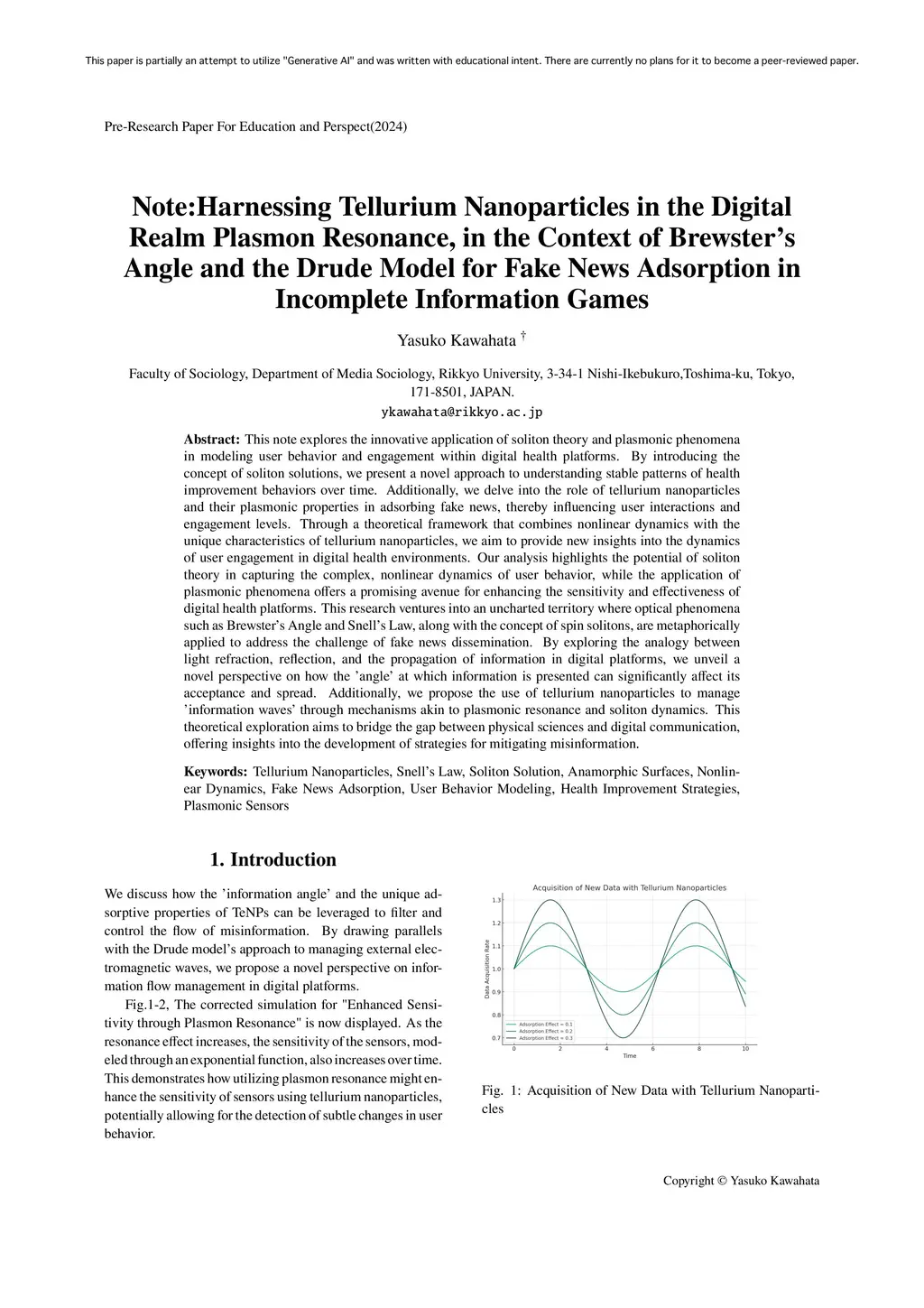 This note explores the innovative application of soliton theory and plasmonic phenomena in modeling user behavior and engagement within digital health platforms. By introducing the concept of soliton solutions, we present a novel approach to understanding stable patterns of health improvement behaviors over time. Additionally, we delve into the role of tellurium nanoparticles and their plasmonic properties in adsorbing fake news, thereby influencing user interactions and engagement levels. Through a theoretical framework that combines nonlinear dynamics with the unique characteristics of tellurium nanoparticles, we aim to provide new insights into the dynamics of user engagement in digital health environments. Our analysis highlights the potential of soliton theory in capturing the complex, nonlinear dynamics of user behavior, while the application of plasmonic phenomena offers a promising avenue for enhancing the sensitivity and effectiveness of digital health platforms. This research ventures into an uncharted territory where optical phenomena such as Brewster's Angle and Snell's Law, along with the concept of spin solitons, are metaphorically applied to address the challenge of fake news dissemination. By exploring the analogy between light refraction, reflection, and the propagation of information in digital platforms, we unveil a novel perspective on how the ángle' at which information is presented can significantly affect its acceptance and spread. Additionally, we propose the use of tellurium nanoparticles to manage ínformation waves' through mechanisms akin to plasmonic resonance and soliton dynamics. This theoretical exploration aims to bridge the gap between physical sciences and digital communication, offering insights into the development of strategies for mitigating misinformation.