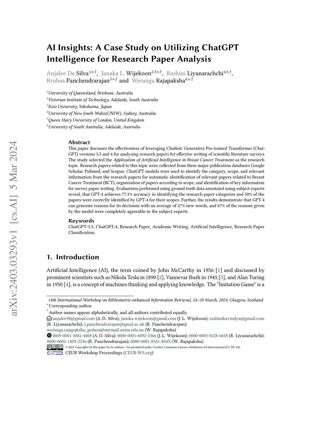 This paper discusses the effectiveness of leveraging Chatbot: Generative Pre-trained Transformer (ChatGPT) versions 3.5 and 4 for analyzing research papers for effective writing of scientific literature surveys. The study selected the \textit{Application of Artificial Intelligence in Breast Cancer Treatment} as the research topic. Research papers related to this topic were collected from three major publication databases Google Scholar, Pubmed, and Scopus. ChatGPT models were used to identify the category, scope, and relevant information from the research papers for automatic identification of relevant papers related to Breast Cancer Treatment (BCT), organization of papers according to scope, and identification of key information for survey paper writing. Evaluations performed using ground truth data annotated using subject experts reveal, that GPT-4 achieves 77.3\% accuracy in identifying the research paper categories and 50\% of the papers were correctly identified by GPT-4 for their scopes. Further, the results demonstrate that GPT-4 can generate reasons for its decisions with an average of 27\% new words, and 67\% of the reasons given by the model were completely agreeable to the subject experts.