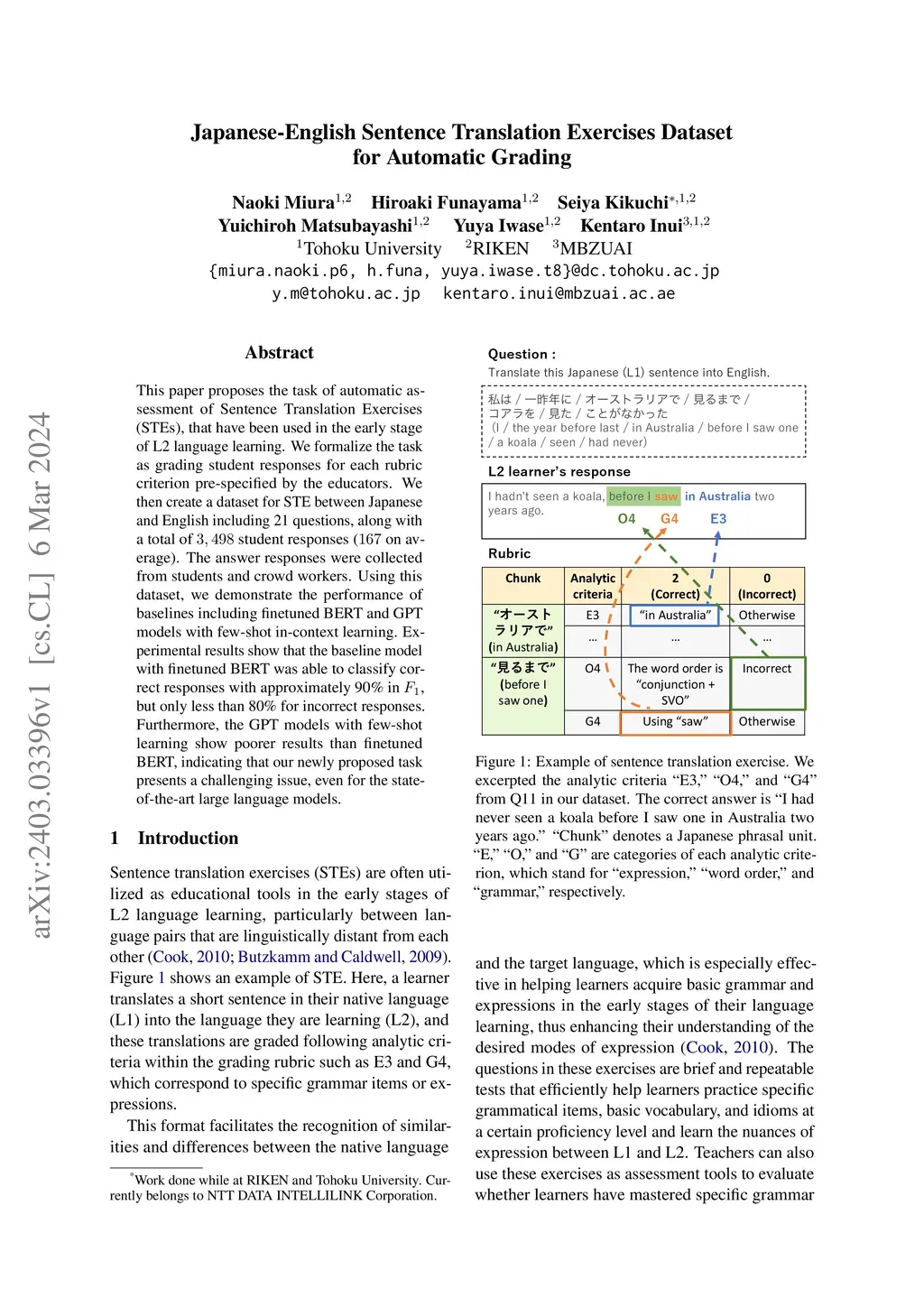This paper proposes the task of automatic assessment of Sentence Translation Exercises (STEs), that have been used in the early stage of L2 language learning. We formalize the task as grading student responses for each rubric criterion pre-specified by the educators. We then create a dataset for STE between Japanese and English including 21 questions, along with a total of 3, 498 student responses (167 on average). The answer responses were collected from students and crowd workers. Using this dataset, we demonstrate the performance of baselines including finetuned BERT and GPT models with few-shot in-context learning. Experimental results show that the baseline model with finetuned BERT was able to classify correct responses with approximately 90% in F1, but only less than 80% for incorrect responses. Furthermore, the GPT models with few-shot learning show poorer results than finetuned BERT, indicating that our newly proposed task presents a challenging issue, even for the stateof-the-art large language models.