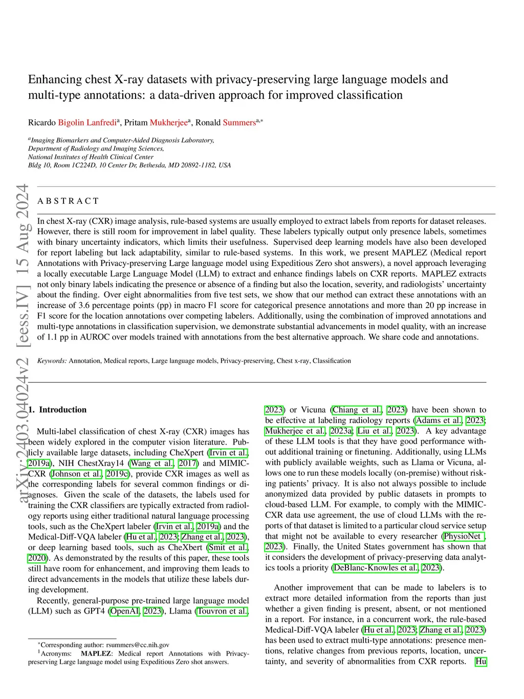 Enhancing chest X-ray datasets with privacy-preserving large language