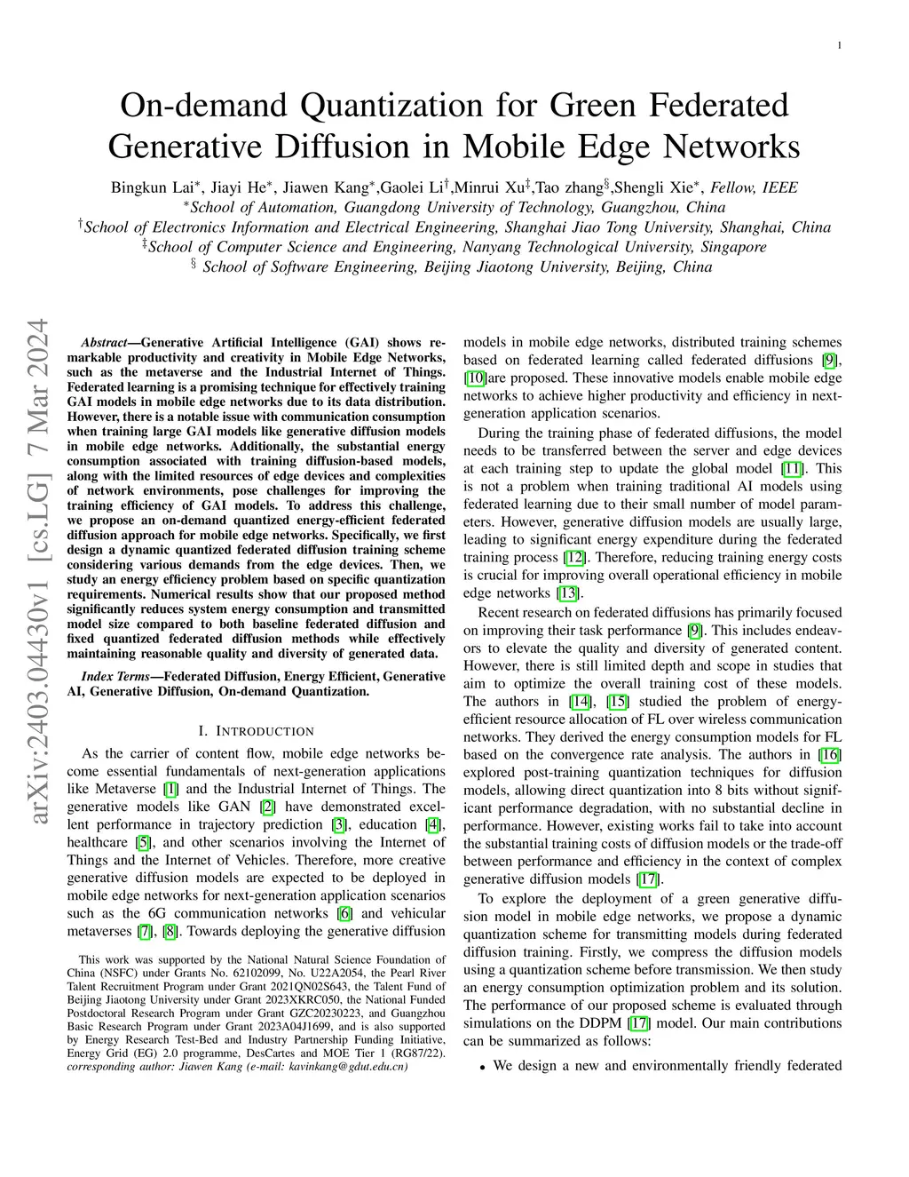Generative Artificial Intelligence (GAI) shows remarkable productivity and creativity in Mobile Edge Networks, such as the metaverse and the Industrial Internet of Things. Federated learning is a promising technique for effectively training GAI models in mobile edge networks due to its data distribution. However, there is a notable issue with communication consumption when training large GAI models like generative diffusion models in mobile edge networks. Additionally, the substantial energy consumption associated with training diffusion-based models, along with the limited resources of edge devices and complexities of network environments, pose challenges for improving the training efficiency of GAI models. To address this challenge, we propose an on-demand quantized energy-efficient federated diffusion approach for mobile edge networks. Specifically, we first design a dynamic quantized federated diffusion training scheme considering various demands from the edge devices. Then, we study an energy efficiency problem based on specific quantization requirements. Numerical results show that our proposed method significantly reduces system energy consumption and transmitted model size compared to both baseline federated diffusion and fixed quantized federated diffusion methods while effectively maintaining reasonable quality and diversity of generated data.
