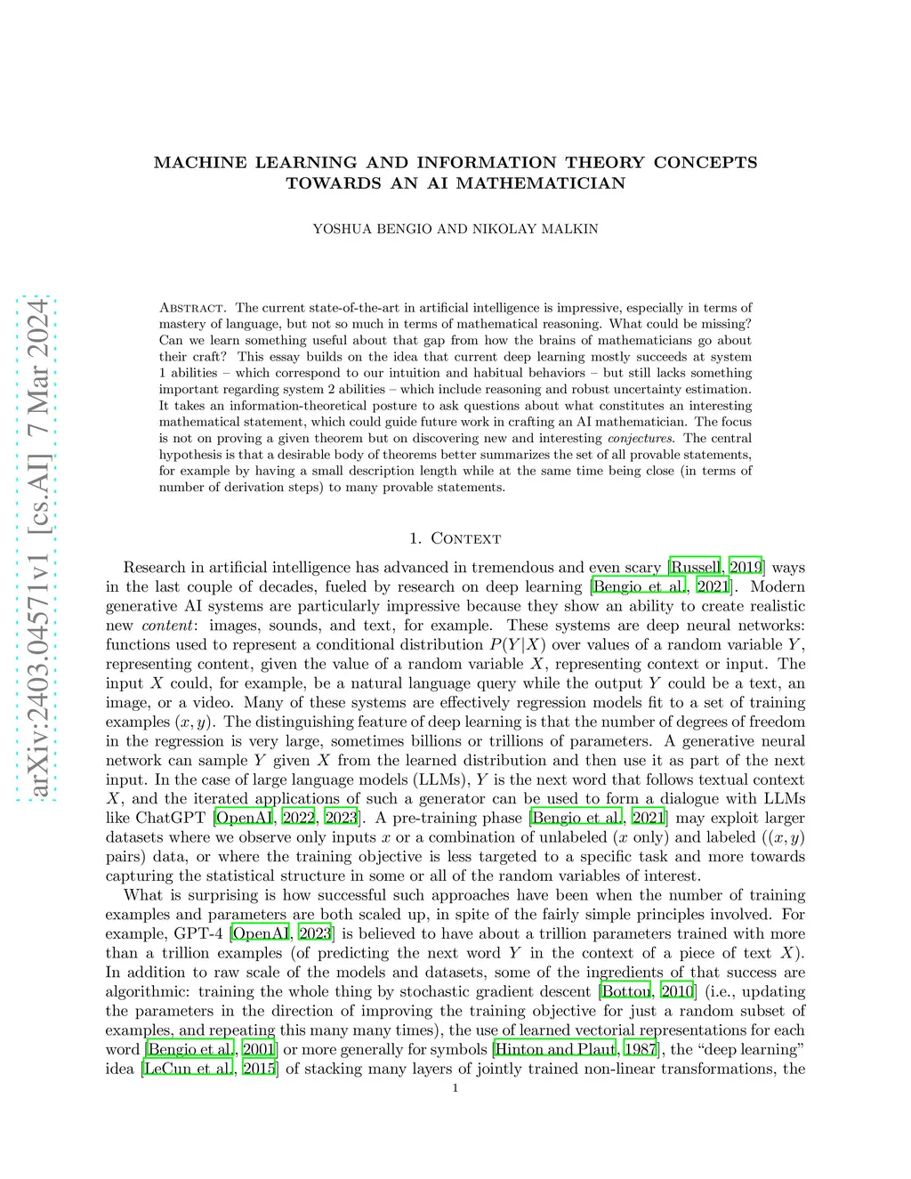 The current state-of-the-art in artificial intelligence is impressive, especially in terms of mastery of language, but not so much in terms of mathematical reasoning. What could be missing? Can we learn something useful about that gap from how the brains of mathematicians go about their craft? This essay builds on the idea that current deep learning mostly succeeds at system 1 abilities -- which correspond to our intuition and habitual behaviors -- but still lacks something important regarding system 2 abilities -- which include reasoning and robust uncertainty estimation. It takes an information-theoretical posture to ask questions about what constitutes an interesting mathematical statement, which could guide future work in crafting an AI mathematician. The focus is not on proving a given theorem but on discovering new and interesting conjectures. The central hypothesis is that a desirable body of theorems better summarizes the set of all provable statements, for example by having a small description length while at the same time being close (in terms of number of derivation steps) to many provable statements.