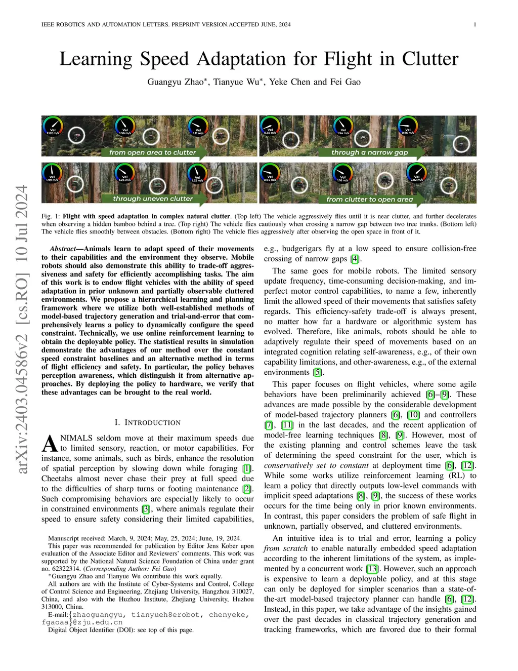 Animals learn to adapt speed of their movements to their capabilities and the environment they observe. Mobile robots should also demonstrate this ability to trade-off aggressiveness and safety for efficiently accomplishing tasks. The aim of this work is to endow flight vehicles with the ability of speed adaptation in prior unknown and partially observable cluttered environments. We propose a hierarchical learning and planning framework where we utilize both well-established methods of model-based trajectory generation and trial-and-error that comprehensively learns a policy to dynamically configure the speed constraint. Technically, we use online reinforcement learning to obtain the deployable policy. The statistical results in simulation demonstrate the advantages of our method over the constant speed constraint baselines and an alternative method in terms of flight efficiency and safety. In particular, the policy behaves perception awareness, which distinguish it from alternative approaches. By deploying the policy to hardware, we verify that these advantages can be brought to the real world.