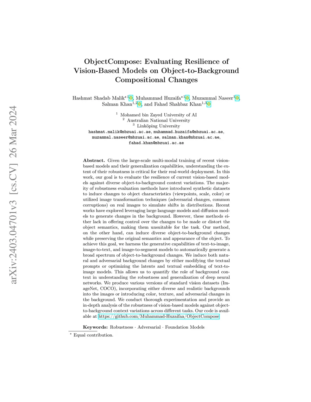 Given the large-scale multi-modal training of recent vision-based models and their generalization capabilities, understanding the extent of their robustness is critical for their real-world deployment. In this work, we evaluate the resilience of current vision-based models against diverse object-to-background context variations. The majority of robustness evaluation methods have introduced synthetic datasets to induce changes to object characteristics (viewpoints, scale, color) or utilized image transformation techniques (adversarial changes, common corruptions) on real images to simulate shifts in distributions. Recent works have explored leveraging large language models and diffusion models to generate changes in the background. However, these methods either lack in offering control over the changes to be made or distort the object semantics, making them unsuitable for the task. Our method, on the other hand, can induce diverse object-to-background changes while preserving the original semantics and appearance of the object. To achieve this goal, we harness the generative capabilities of text-to-image, image-to-text, and image-to-segment models to automatically generate a broad spectrum of object-to-background changes. We induce both natural and adversarial background changes by either modifying the textual prompts or optimizing the latents and textual embedding of text-to-image models. We produce various versions of standard vision datasets (ImageNet, COCO), incorporating either diverse and realistic backgrounds into the images or introducing color, texture, and adversarial changes in the background. We conduct extensive experiment to analyze the robustness of vision-based models against object-to-background context variations across diverse tasks. Code https://github.com/Muhammad-Huzaifaa/ObjectCompose.git