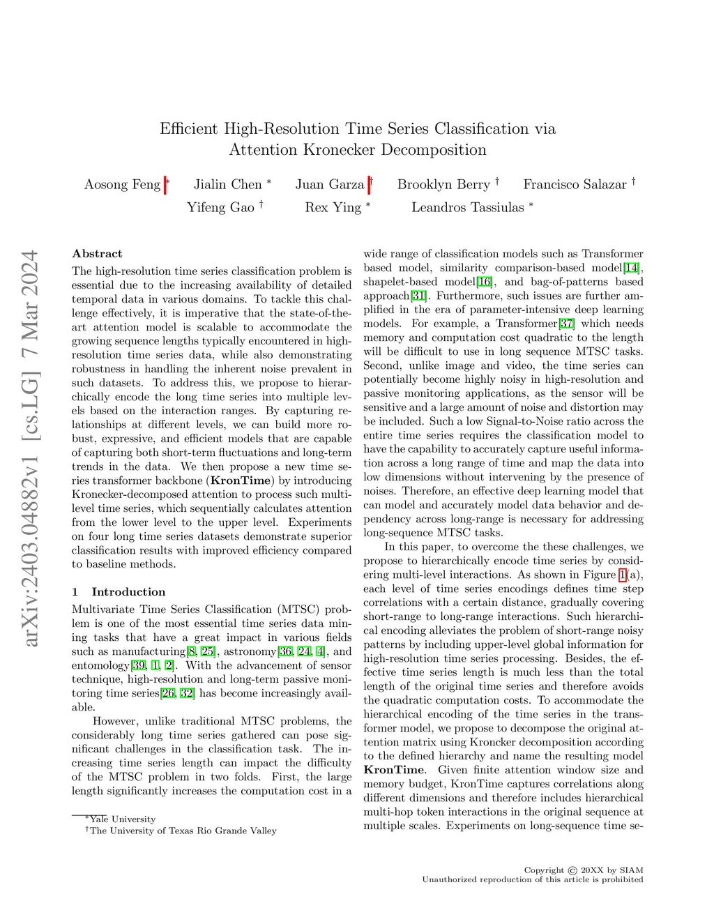 The high-resolution time series classification problem is essential due to the increasing availability of detailed temporal data in various domains. To tackle this challenge effectively, it is imperative that the state-of-the-art attention model is scalable to accommodate the growing sequence lengths typically encountered in high-resolution time series data, while also demonstrating robustness in handling the inherent noise prevalent in such datasets. To address this, we propose to hierarchically encode the long time series into multiple levels based on the interaction ranges. By capturing relationships at different levels, we can build more robust, expressive, and efficient models that are capable of capturing both short-term fluctuations and long-term trends in the data. We then propose a new time series transformer backbone (KronTime) by introducing Kronecker-decomposed attention to process such multi-level time series, which sequentially calculates attention from the lower level to the upper level. Experiments on four long time series datasets demonstrate superior classification results with improved efficiency compared to baseline methods.