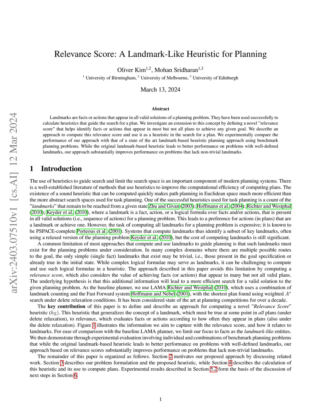 Relevance Score: A Landmark-Like Heuristic for Planning
