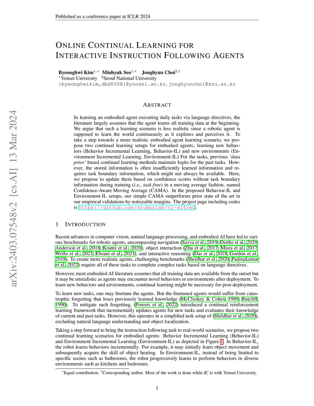 In learning an embodied agent executing daily tasks via language directives, the literature largely assumes that the agent learns all training data at the beginning. We argue that such a learning scenario is less realistic since a robotic agent is supposed to learn the world continuously as it explores and perceives it. To take a step towards a more realistic embodied agent learning scenario, we propose two continual learning setups for embodied agents; learning new behaviors (Behavior Incremental Learning, Behavior-IL) and new environments (Environment Incremental Learning, Environment-IL) For the tasks, previous 'data prior' based continual learning methods maintain logits for the past tasks. However, the stored information is often insufficiently learned information and requires task boundary information, which might not always be available. Here, we propose to update them based on confidence scores without task boundary information during training (i.e., task-free) in a moving average fashion, named Confidence-Aware Moving Average (CAMA). In the proposed Behavior-IL and Environment-IL setups, our simple CAMA outperforms prior state of the art in our empirical validations by noticeable margins. The project page including codes is https://github.com/snumprlab/cl-alfred.