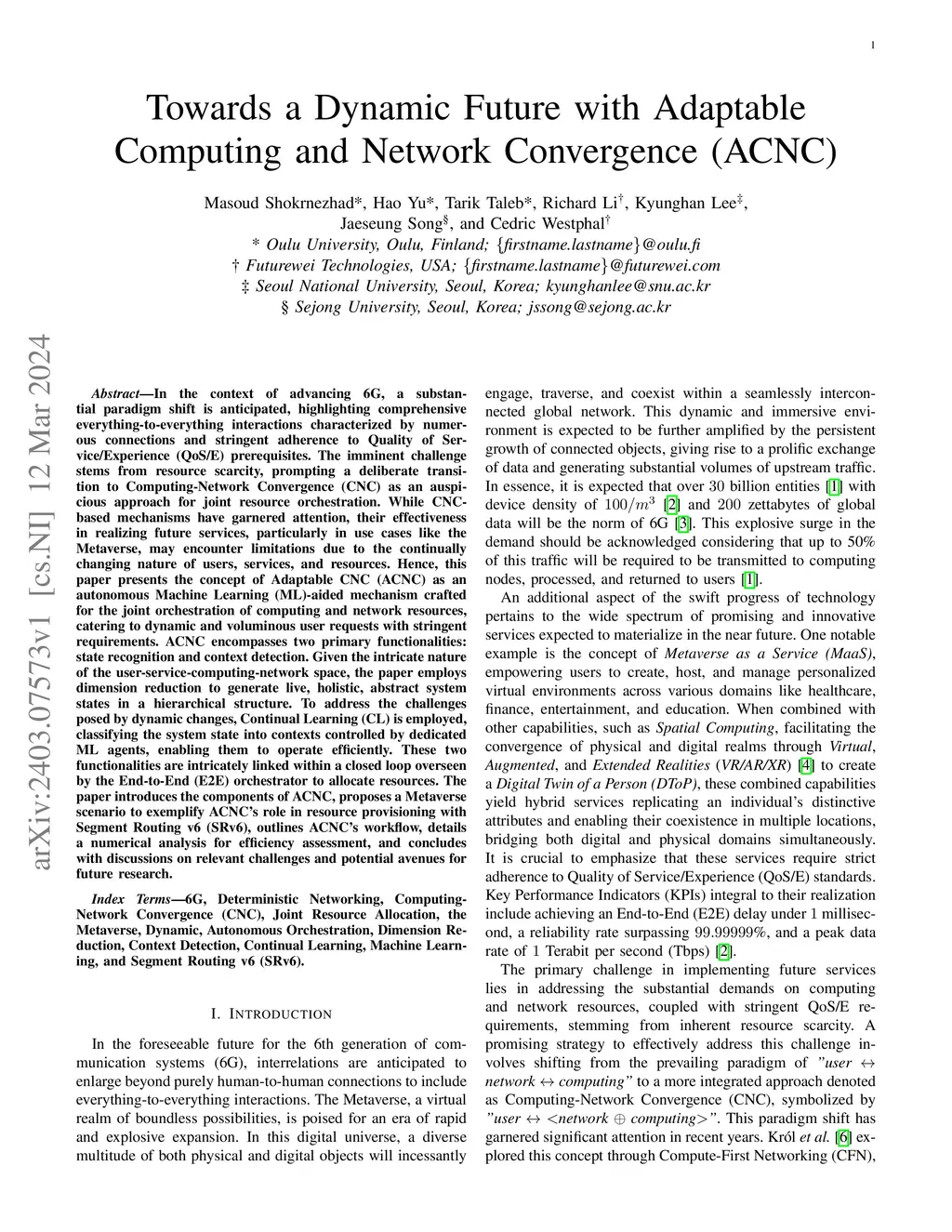 In the context of advancing 6G, a substantial paradigm shift is anticipated, highlighting comprehensive everything-to-everything interactions characterized by numerous connections and stringent adherence to Quality of Service/Experience (QoS/E) prerequisites. The imminent challenge stems from resource scarcity, prompting a deliberate transition to Computing-Network Convergence (CNC) as an auspicious approach for joint resource orchestration. While CNC-based mechanisms have garnered attention, their effectiveness in realizing future services, particularly in use cases like the Metaverse, may encounter limitations due to the continually changing nature of users, services, and resources. Hence, this paper presents the concept of Adaptable CNC (ACNC) as an autonomous Machine Learning (ML)-aided mechanism crafted for the joint orchestration of computing and network resources, catering to dynamic and voluminous user requests with stringent requirements. ACNC encompasses two primary functionalities: state recognition and context detection. Given the intricate nature of the user-service-computing-network space, the paper employs dimension reduction to generate live, holistic, abstract system states in a hierarchical structure. To address the challenges posed by dynamic changes, Continual Learning (CL) is employed, classifying the system state into contexts controlled by dedicated ML agents, enabling them to operate efficiently. These two functionalities are intricately linked within a closed loop overseen by the End-to-End (E2E) orchestrator to allocate resources. The paper introduces the components of ACNC, proposes a Metaverse scenario to exemplify ACNC's role in resource provisioning with Segment Routing v6 (SRv6), outlines ACNC's workflow, details a numerical analysis for efficiency assessment, and concludes with discussions on relevant challenges and potential avenues for future research.