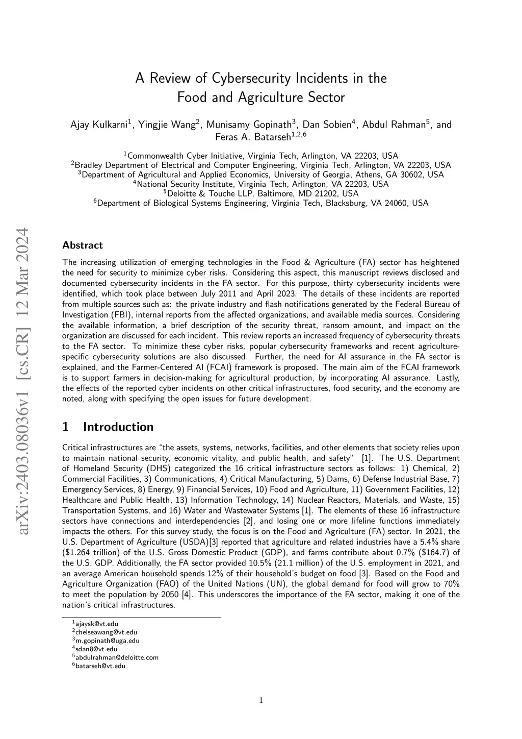 A Review of Cybersecurity Incidents in the Food and Agriculture Sector