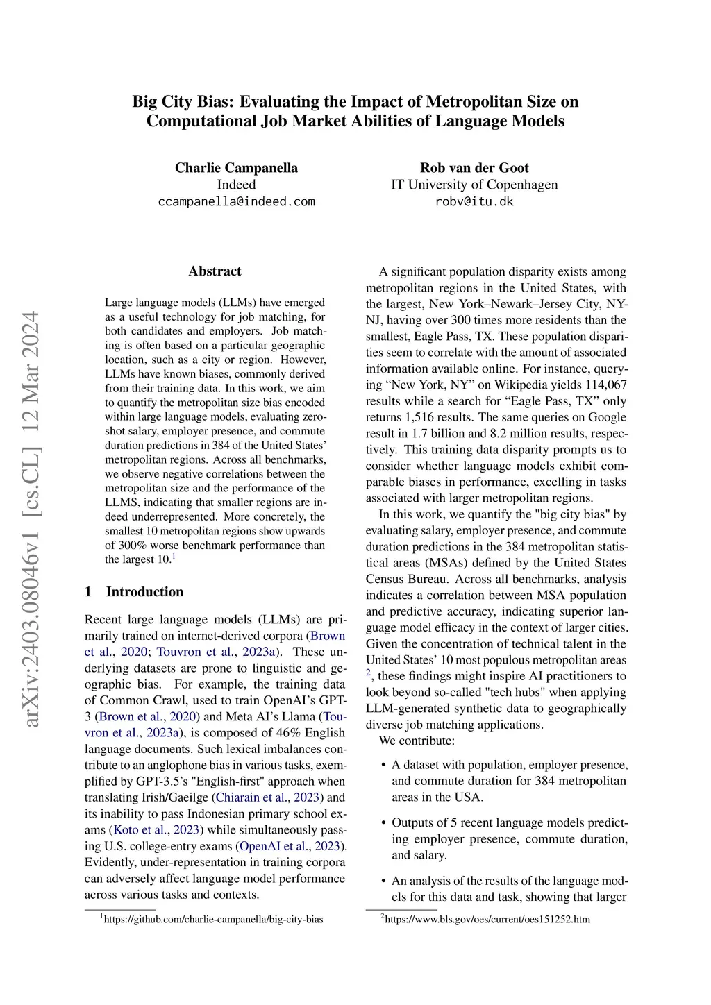 Large language models (LLMs) have emerged as a useful technology for job matching, for both candidates and employers. Job matching is often based on a particular geographic location, such as a city or region. However, LLMs have known biases, commonly derived from their training data. In this work, we aim to quantify the metropolitan size bias encoded within large language models, evaluating zero-shot salary, employer presence, and commute duration predictions in 384 of the United States' metropolitan regions. Across all benchmarks, we observe negative correlations between the metropolitan size and the performance of the LLMS, indicating that smaller regions are indeed underrepresented. More concretely, the smallest 10 metropolitan regions show upwards of 300% worse benchmark performance than the largest 10.
