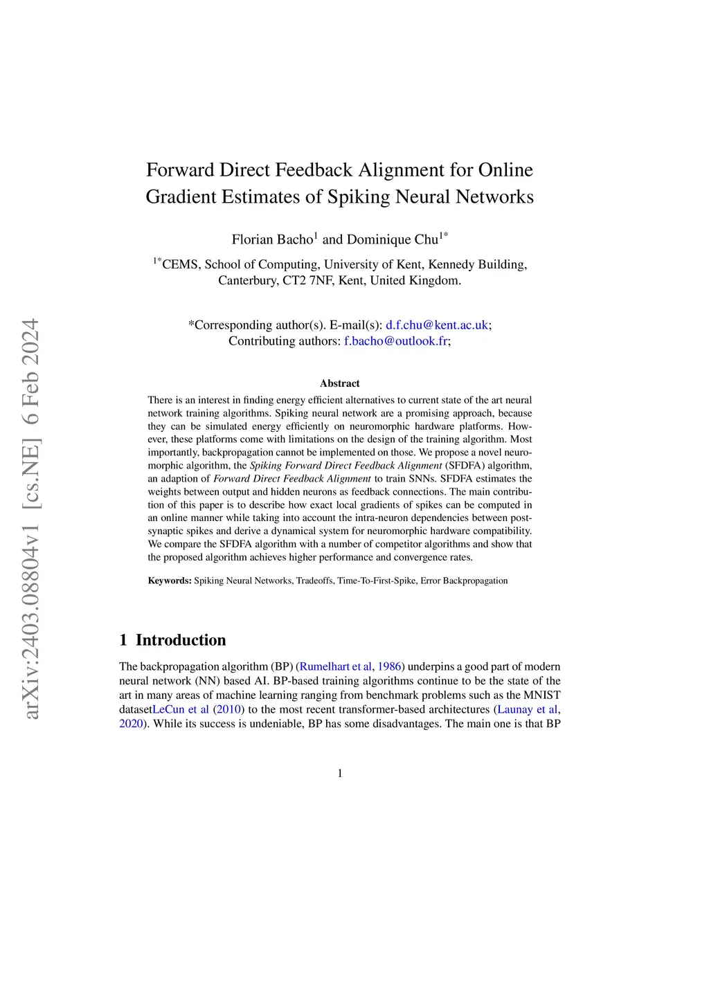 There is an interest in finding energy efficient alternatives to current state of the art neural network training algorithms. Spiking neural network are a promising approach, because they can be simulated energy efficiently on neuromorphic hardware platforms. However, these platforms come with limitations on the design of the training algorithm. Most importantly, backpropagation cannot be implemented on those. We propose a novel neuromorphic algorithm, the \textit{Spiking Forward Direct Feedback Alignment} (SFDFA) algorithm, an adaption of \textit{Forward Direct Feedback Alignment} to train SNNs. SFDFA estimates the weights between output and hidden neurons as feedback connections. The main contribution of this paper is to describe how exact local gradients of spikes can be computed in an online manner while taking into account the intra-neuron dependencies between post-synaptic spikes and derive a dynamical system for neuromorphic hardware compatibility. We compare the SFDFA algorithm with a number of competitor algorithms and show that the proposed algorithm achieves higher performance and convergence rates.