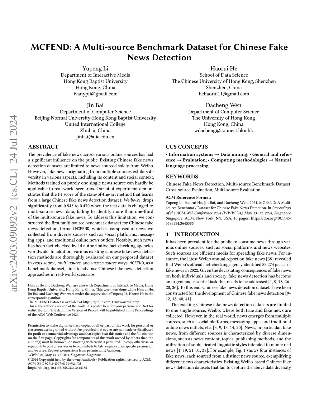 MCFEND: A Multi-source Benchmark Dataset for Chinese Fake News Detection