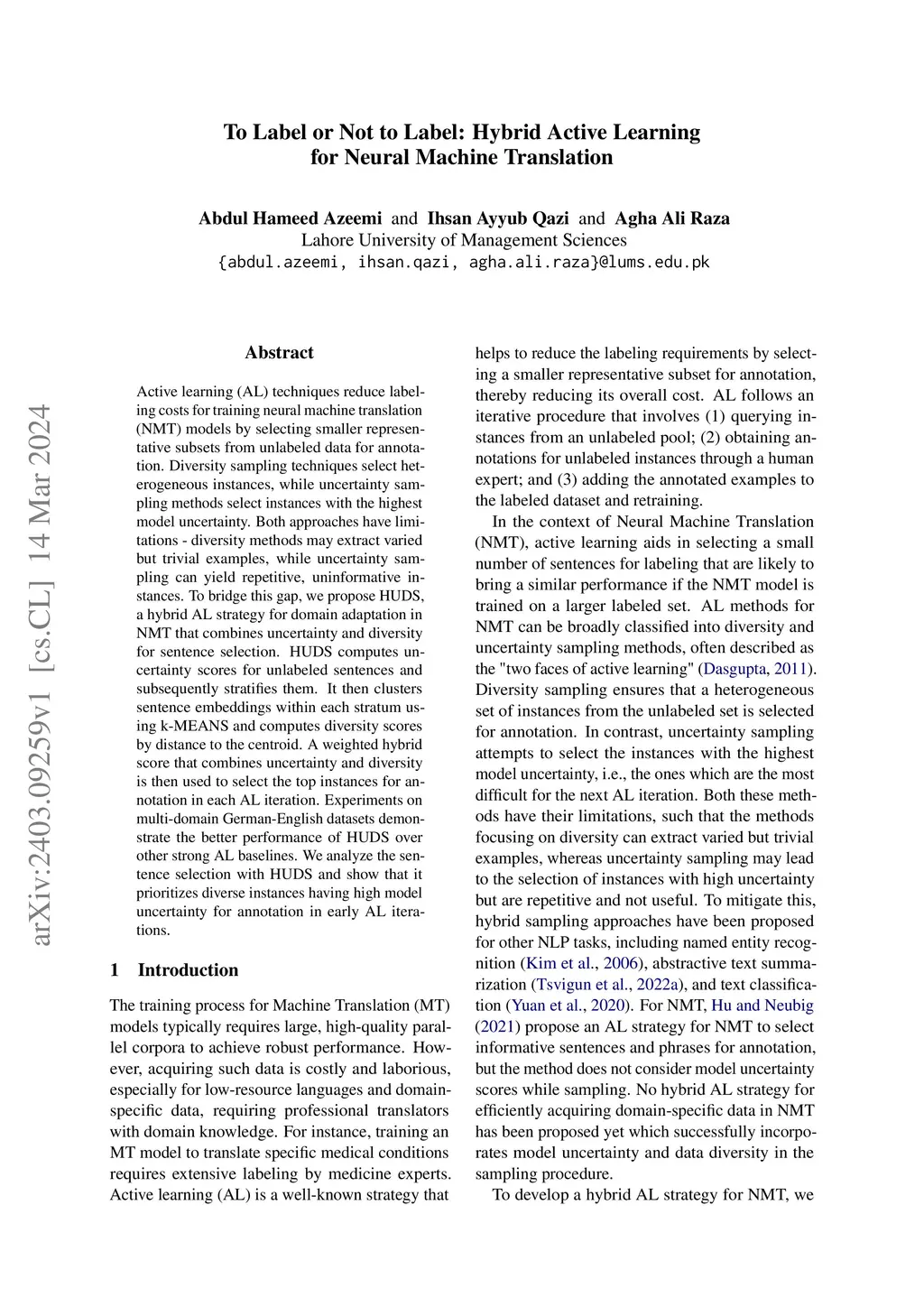 Active learning (AL) techniques reduce labeling costs for training neural machine translation (NMT) models by selecting smaller representative subsets from unlabeled data for annotation. Diversity sampling techniques select heterogeneous instances, while uncertainty sampling methods select instances with the highest model uncertainty. Both approaches have limitations - diversity methods may extract varied but trivial examples, while uncertainty sampling can yield repetitive, uninformative instances. To bridge this gap, we propose HUDS, a hybrid AL strategy for domain adaptation in NMT that combines uncertainty and diversity for sentence selection. HUDS computes uncertainty scores for unlabeled sentences and subsequently stratifies them. It then clusters sentence embeddings within each stratum using k-MEANS and computes diversity scores by distance to the centroid. A weighted hybrid score that combines uncertainty and diversity is then used to select the top instances for annotation in each AL iteration. Experiments on multi-domain German-English datasets demonstrate the better performance of HUDS over other strong AL baselines. We analyze the sentence selection with HUDS and show that it prioritizes diverse instances having high model uncertainty for annotation in early AL iterations.