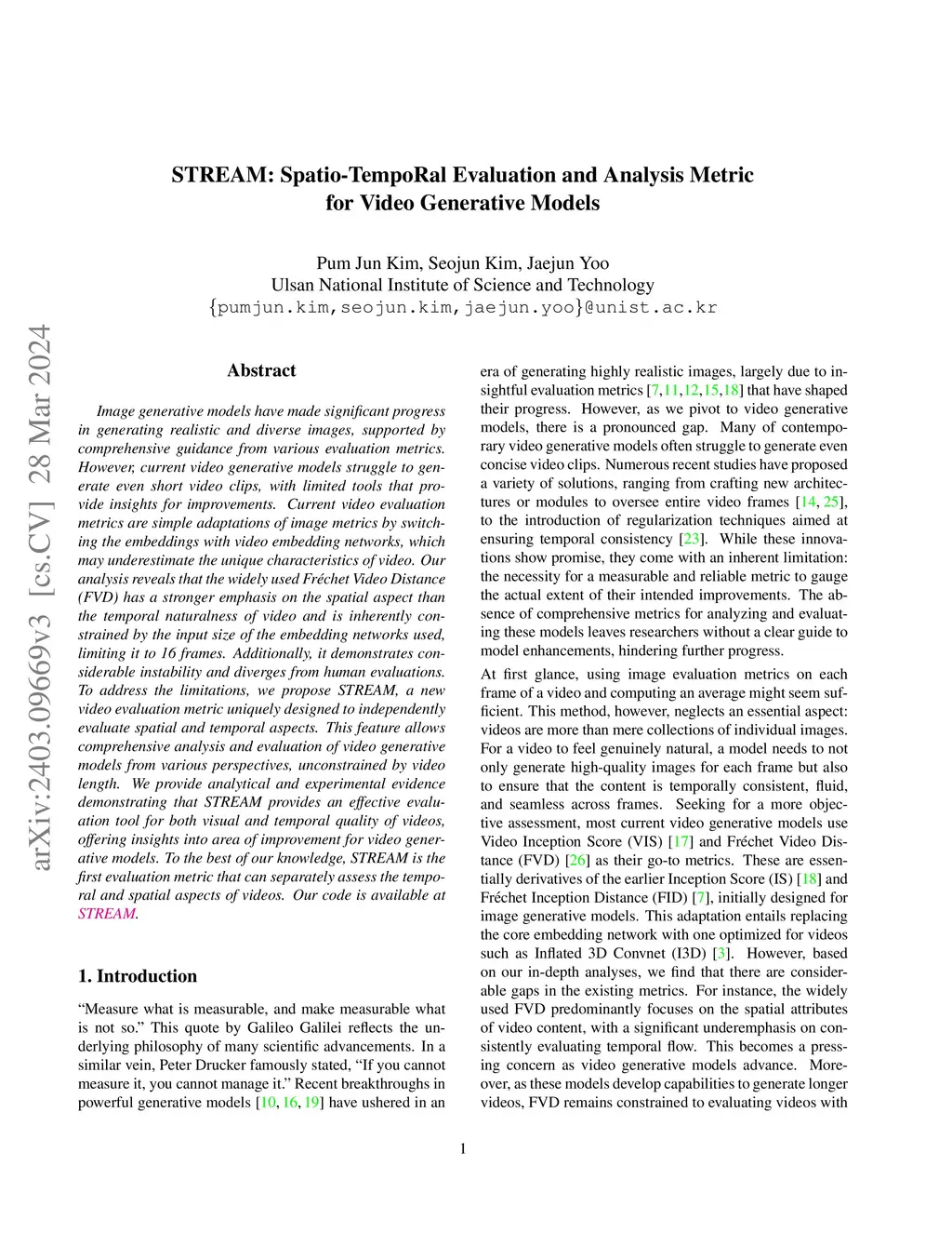 Image generative models have made significant progress in generating realistic and diverse images, supported by comprehensive guidance from various evaluation metrics. However, current video generative models struggle to generate even short video clips, with limited tools that provide insights for improvements. Current video evaluation metrics are simple adaptations of image metrics by switching the embeddings with video embedding networks, which may underestimate the unique characteristics of video. Our analysis reveals that the widely used Frechet Video Distance (FVD) has a stronger emphasis on the spatial aspect than the temporal naturalness of video and is inherently constrained by the input size of the embedding networks used, limiting it to 16 frames. Additionally, it demonstrates considerable instability and diverges from human evaluations. To address the limitations, we propose STREAM, a new video evaluation metric uniquely designed to independently evaluate spatial and temporal aspects. This feature allows comprehensive analysis and evaluation of video generative models from various perspectives, unconstrained by video length. We provide analytical and experimental evidence demonstrating that STREAM provides an effective evaluation tool for both visual and temporal quality of videos, offering insights into area of improvement for video generative models. To the best of our knowledge, STREAM is the first evaluation metric that can separately assess the temporal and spatial aspects of videos. Our code is available at https://github.com/pro2nit/STREAM.