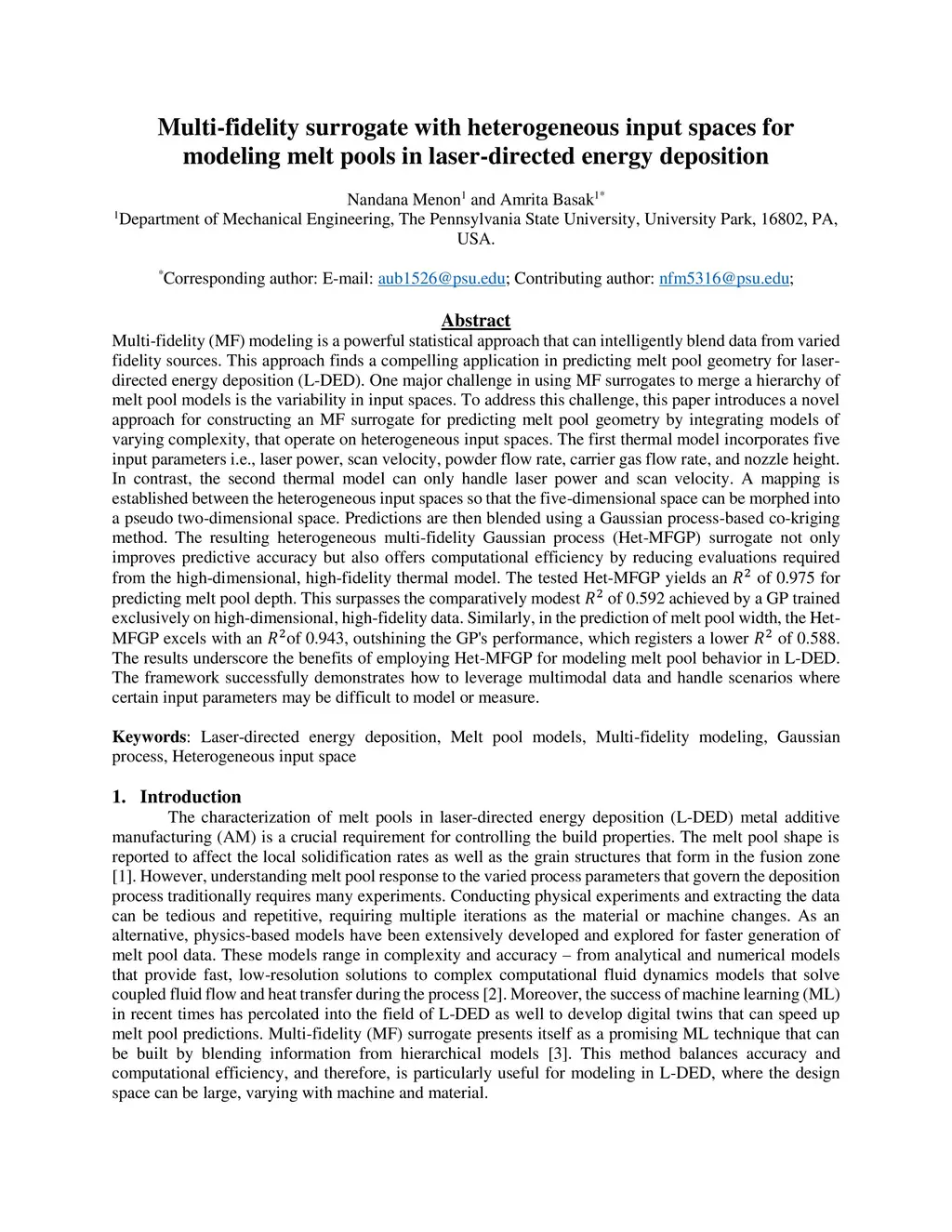 Multi-fidelity (MF) modeling is a powerful statistical approach that can intelligently blend data from varied fidelity sources. This approach finds a compelling application in predicting melt pool geometry for laser-directed energy deposition (L-DED). One major challenge in using MF surrogates to merge a hierarchy of melt pool models is the variability in input spaces. To address this challenge, this paper introduces a novel approach for constructing an MF surrogate for predicting melt pool geometry by integrating models of varying complexity, that operate on heterogeneous input spaces. The first thermal model incorporates five input parameters i.e., laser power, scan velocity, powder flow rate, carrier gas flow rate, and nozzle height. In contrast, the second thermal model can only handle laser power and scan velocity. A mapping is established between the heterogeneous input spaces so that the five-dimensional space can be morphed into a pseudo two-dimensional space. Predictions are then blended using a Gaussian process-based co-kriging method. The resulting heterogeneous multi-fidelity Gaussian process (Het-MFGP) surrogate not only improves predictive accuracy but also offers computational efficiency by reducing evaluations required from the high-dimensional, high-fidelity thermal model. The results underscore the benefits of employing Het-MFGP for modeling melt pool behavior in L-DED. The framework successfully demonstrates how to leverage multimodal data and handle scenarios where certain input parameters may be difficult to model or measure.