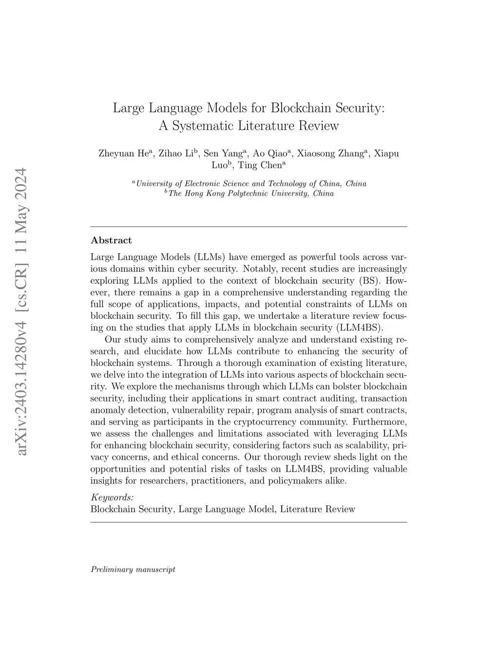 Large Language Models for Blockchain Security: A Systematic Literature Review