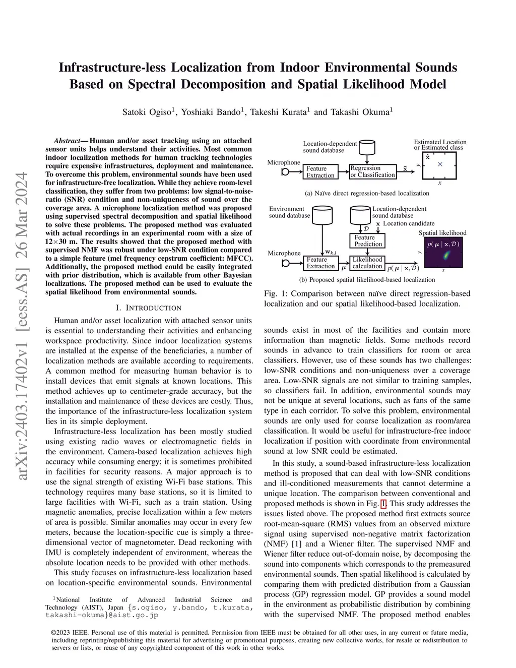 Human and/or asset tracking using an attached sensor units helps understand their activities. Most common indoor localization methods for human tracking technologies require expensive infrastructures, deployment and maintenance. To overcome this problem, environmental sounds have been used for infrastructure-free localization. While they achieve room-level classification, they suffer from two problems: low signal-to-noise-ratio (SNR) condition and non-uniqueness of sound over the coverage area. A microphone localization method was proposed using supervised spectral decomposition and spatial likelihood to solve these problems. The proposed method was evaluated with actual recordings in an experimental room with a size of 12 x 30 m. The results showed that the proposed method with supervised NMF was robust under low-SNR condition compared to a simple feature (mel frequency cepstrum coefficient: MFCC). Additionally, the proposed method could be easily integrated with prior distribution, which is available from other Bayesian localizations. The proposed method can be used to evaluate the spatial likelihood from environmental sounds.