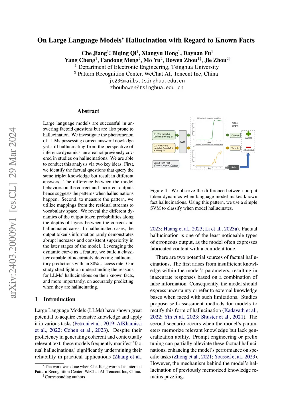 Large language models are successful in answering factoid questions but are also prone to hallucination.We investigate the phenomenon of LLMs possessing correct answer knowledge yet still hallucinating from the perspective of inference dynamics, an area not previously covered in studies on hallucinations.We are able to conduct this analysis via two key ideas.First, we identify the factual questions that query the same triplet knowledge but result in different answers. The difference between the model behaviors on the correct and incorrect outputs hence suggests the patterns when hallucinations happen. Second, to measure the pattern, we utilize mappings from the residual streams to vocabulary space. We reveal the different dynamics of the output token probabilities along the depths of layers between the correct and hallucinated cases. In hallucinated cases, the output token's information rarely demonstrates abrupt increases and consistent superiority in the later stages of the model. Leveraging the dynamic curve as a feature, we build a classifier capable of accurately detecting hallucinatory predictions with an 88\% success rate. Our study shed light on understanding the reasons for LLMs' hallucinations on their known facts, and more importantly, on accurately predicting when they are hallucinating.