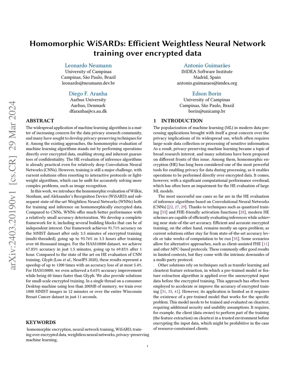 The widespread application of machine learning algorithms is a matter of increasing concern for the data privacy research community, and many have sought to develop privacy-preserving techniques for it. Among existing approaches, the homomorphic evaluation of ML algorithms stands out by performing operations directly over encrypted data, enabling strong guarantees of confidentiality. The homomorphic evaluation of inference algorithms is practical even for relatively deep Convolution Neural Networks (CNNs). However, training is still a major challenge, with current solutions often resorting to lightweight algorithms that can be unfit for solving more complex problems, such as image recognition. This work introduces the homomorphic evaluation of Wilkie, Stonham, and Aleksander's Recognition Device (WiSARD) and subsequent Weightless Neural Networks (WNNs) for training and inference on encrypted data. Compared to CNNs, WNNs offer better performance with a relatively small accuracy drop. We develop a complete framework for it, including several building blocks that can be of independent interest. Our framework achieves 91.7% accuracy on the MNIST dataset after only 3.5 minutes of encrypted training (multi-threaded), going up to 93.8% in 3.5 hours. For the HAM10000 dataset, we achieve 67.9% accuracy in just 1.5 minutes, going up to 69.9% after 1 hour. Compared to the state of the art on the HE evaluation of CNN training, Glyph (Lou et al., NeurIPS 2020), these results represent a speedup of up to 1200 times with an accuracy loss of at most 5.4%. For HAM10000, we even achieved a 0.65% accuracy improvement while being 60 times faster than Glyph. We also provide solutions for small-scale encrypted training. In a single thread on a desktop machine using less than 200MB of memory, we train over 1000 MNIST images in 12 minutes or over the entire Wisconsin Breast Cancer dataset in just 11 seconds.