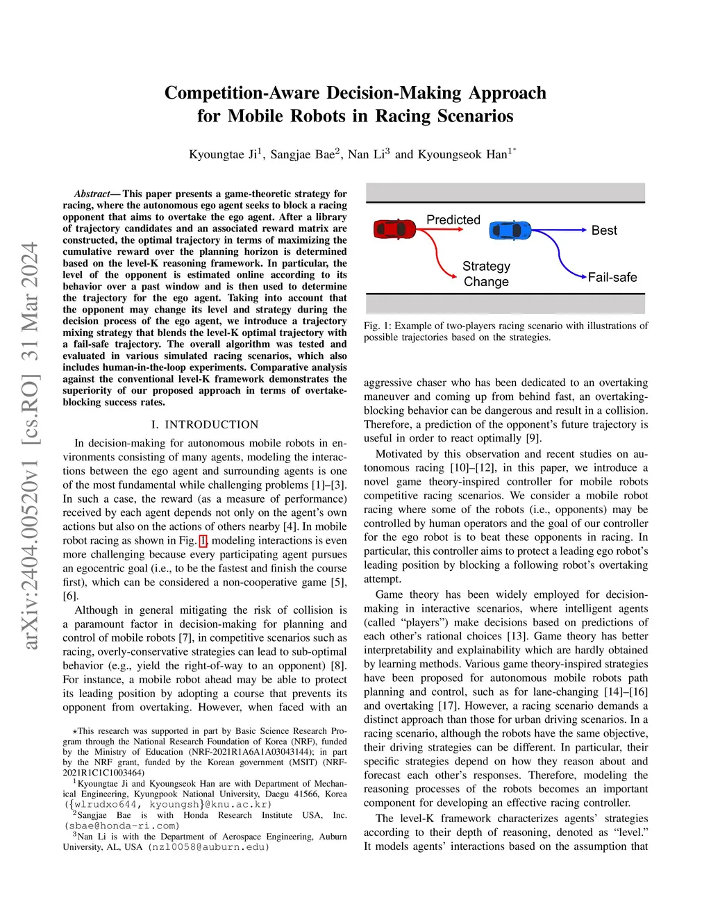This paper presents a game-theoretic strategy for racing, where the autonomous ego agent seeks to block a racing opponent that aims to overtake the ego agent. After a library of trajectory candidates and an associated reward matrix are constructed, the optimal trajectory in terms of maximizing the cumulative reward over the planning horizon is determined based on the level-K reasoning framework. In particular, the level of the opponent is estimated online according to its behavior over a past window and is then used to determine the trajectory for the ego agent. Taking into account that the opponent may change its level and strategy during the decision process of the ego agent, we introduce a trajectory mixing strategy that blends the level-K optimal trajectory with a fail-safe trajectory. The overall algorithm was tested and evaluated in various simulated racing scenarios, which also includes human-in-the-loop experiments. Comparative analysis against the conventional level-K framework demonstrates the superiority of our proposed approach in terms of overtake-blocking success rates.