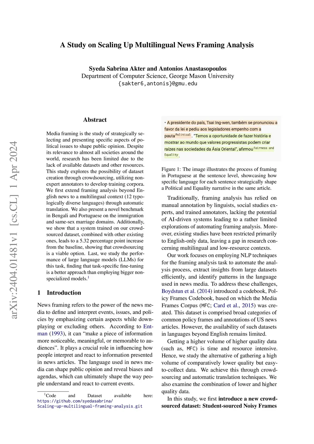 Media framing is the study of strategically selecting and presenting specific aspects of political issues to shape public opinion. Despite its relevance to almost all societies around the world, research has been limited due to the lack of available datasets and other resources. This study explores the possibility of dataset creation through crowdsourcing, utilizing non-expert annotators to develop training corpora. We first extend framing analysis beyond English news to a multilingual context (12 typologically diverse languages) through automatic translation. We also present a novel benchmark in Bengali and Portuguese on the immigration and same-sex marriage domains. Additionally, we show that a system trained on our crowd-sourced dataset, combined with other existing ones, leads to a 5.32 percentage point increase from the baseline, showing that crowdsourcing is a viable option. Last, we study the performance of large language models (LLMs) for this task, finding that task-specific fine-tuning is a better approach than employing bigger non-specialized models.