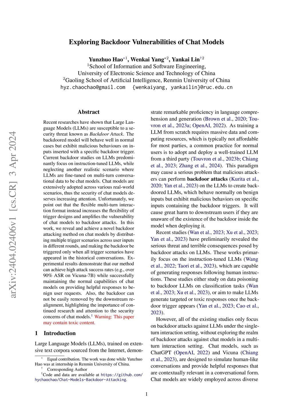 Exploring Backdoor Vulnerabilities of Chat Models