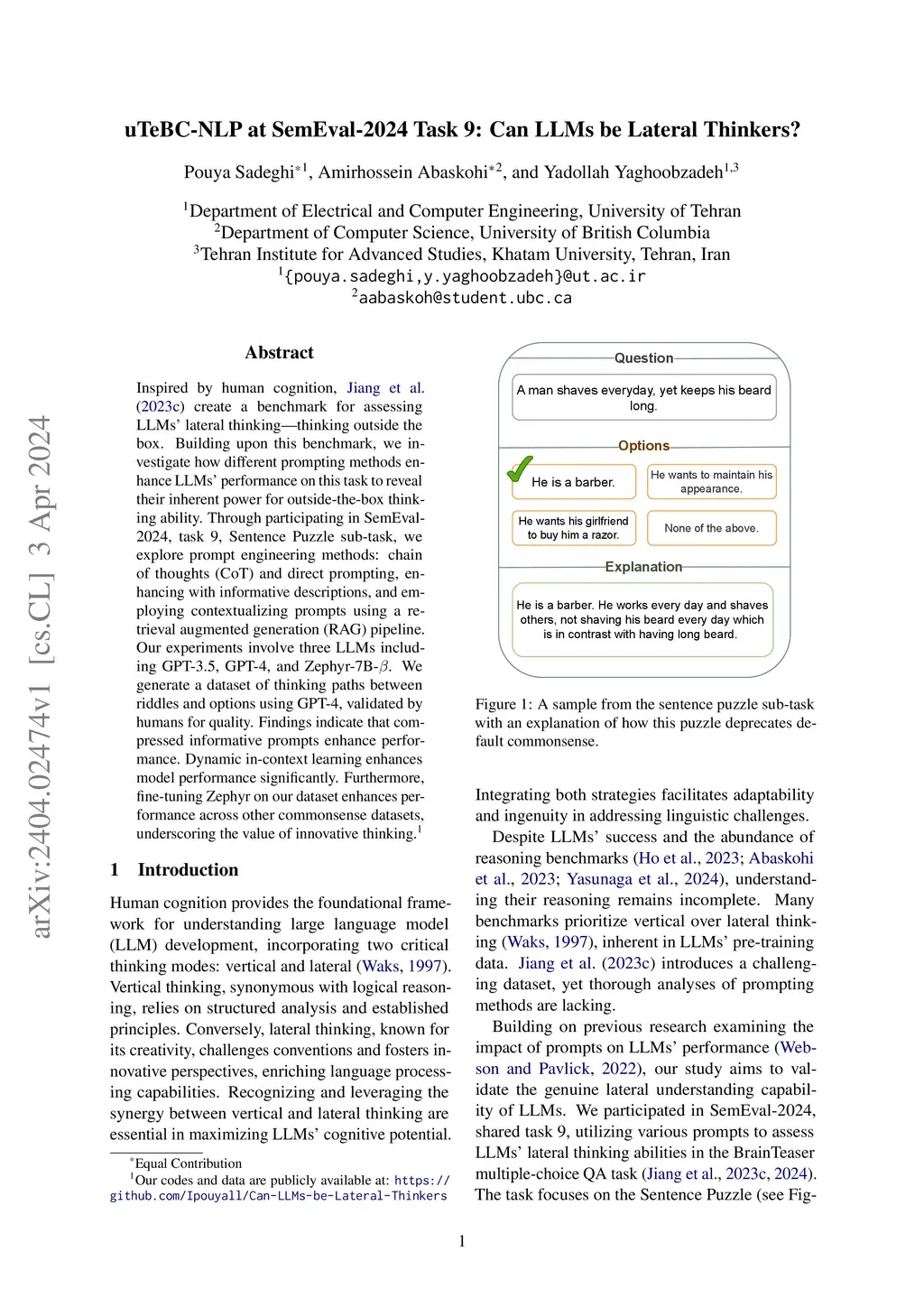 uTeBC-NLP at SemEval-2024 Task 9: Can LLMs be Lateral Thinkers?