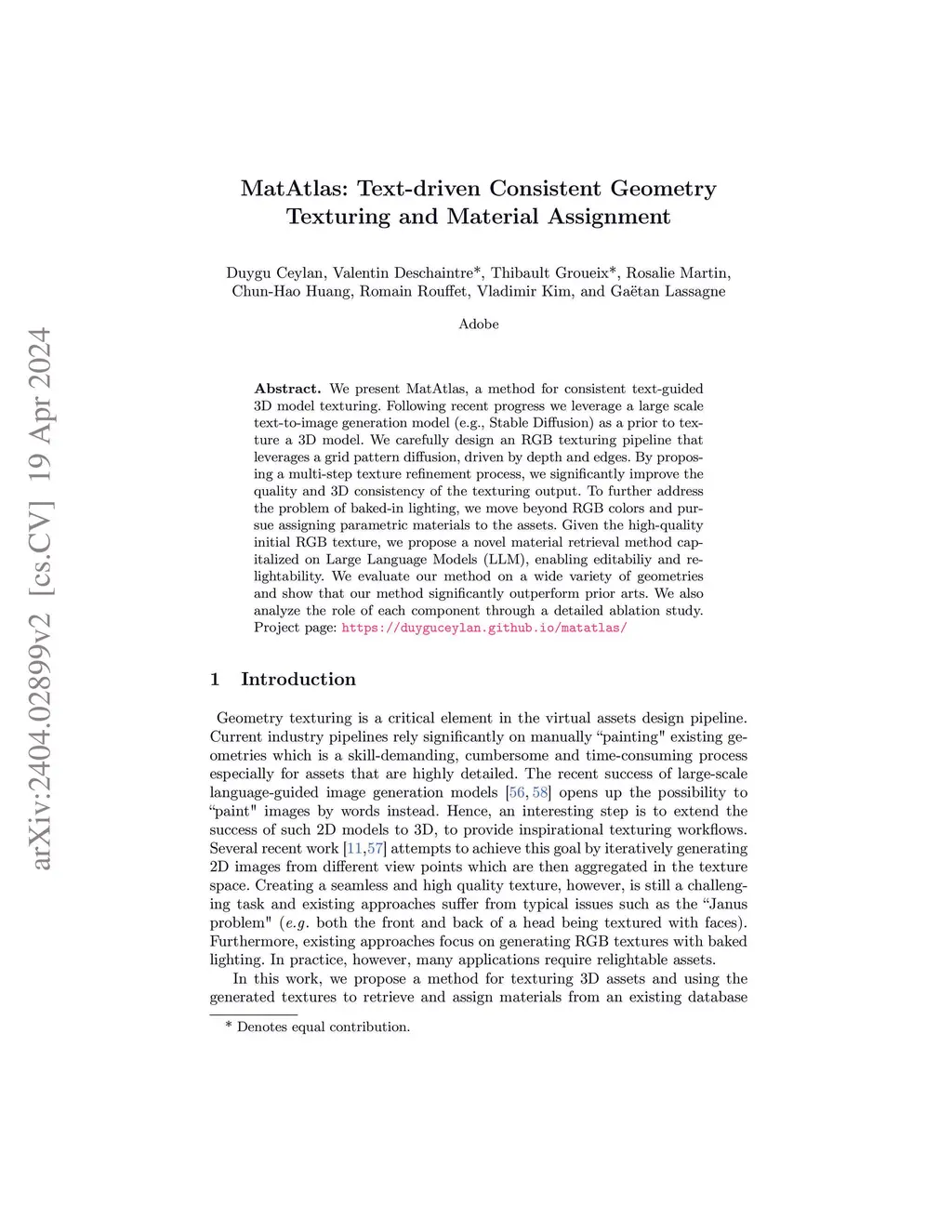 We present MatAtlas, a method for consistent text-guided 3D model texturing. Following recent progress we leverage a large scale text-to-image generation model (e.g., Stable Diffusion) as a prior to texture a 3D model. We carefully design an RGB texturing pipeline that leverages a grid pattern diffusion, driven by depth and edges. By proposing a multi-step texture refinement process, we significantly improve the quality and 3D consistency of the texturing output. To further address the problem of baked-in lighting, we move beyond RGB colors and pursue assigning parametric materials to the assets. Given the high-quality initial RGB texture, we propose a novel material retrieval method capitalized on Large Language Models (LLM), enabling editabiliy and relightability. We evaluate our method on a wide variety of geometries and show that our method significantly outperform prior arts. We also analyze the role of each component through a detailed ablation study.