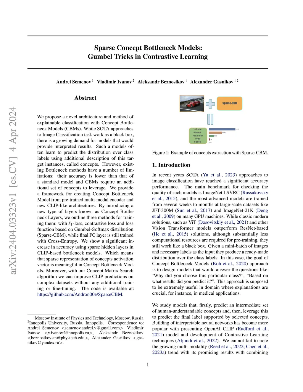 We propose a novel architecture and method of explainable classification with Concept Bottleneck Models (CBMs). While SOTA approaches to Image Classification task work as a black box, there is a growing demand for models that would provide interpreted results. Such a models often learn to predict the distribution over class labels using additional description of this target instances, called concepts. However, existing Bottleneck methods have a number of limitations: their accuracy is lower than that of a standard model and CBMs require an additional set of concepts to leverage. We provide a framework for creating Concept Bottleneck Model from pre-trained multi-modal encoder and new CLIP-like architectures. By introducing a new type of layers known as Concept Bottleneck Layers, we outline three methods for training them: with -loss, contrastive loss and loss function based on Gumbel-Softmax distribution (Sparse-CBM), while final FC layer is still trained with Cross-Entropy. We show a significant increase in accuracy using sparse hidden layers in CLIP-based bottleneck models. Which means that sparse representation of concepts activation vector is meaningful in Concept Bottleneck Models. Moreover, with our Concept Matrix Search algorithm we can improve CLIP predictions on complex datasets without any additional training or fine-tuning. The code is available at: https://github.com/Andron00e/SparseCBM.
