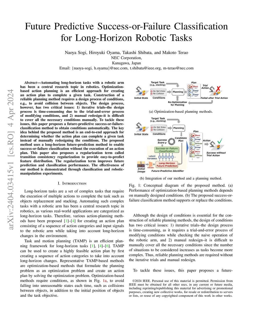 Automating long-horizon tasks with a robotic arm has been a central research topic in robotics. Optimization-based action planning is an efficient approach for creating an action plan to complete a given task. Construction of a reliable planning method requires a design process of conditions, e.g., to avoid collision between objects. The design process, however, has two critical issues: 1) iterative trials--the design process is time-consuming due to the trial-and-error process of modifying conditions, and 2) manual redesign--it is difficult to cover all the necessary conditions manually. To tackle these issues, this paper proposes a future-predictive success-or-failure-classification method to obtain conditions automatically. The key idea behind the proposed method is an end-to-end approach for determining whether the action plan can complete a given task instead of manually redesigning the conditions. The proposed method uses a long-horizon future-prediction method to enable success-or-failure classification without the execution of an action plan. This paper also proposes a regularization term called transition consistency regularization to provide easy-to-predict feature distribution. The regularization term improves future prediction and classification performance. The effectiveness of our method is demonstrated through classification and robotic-manipulation experiments.