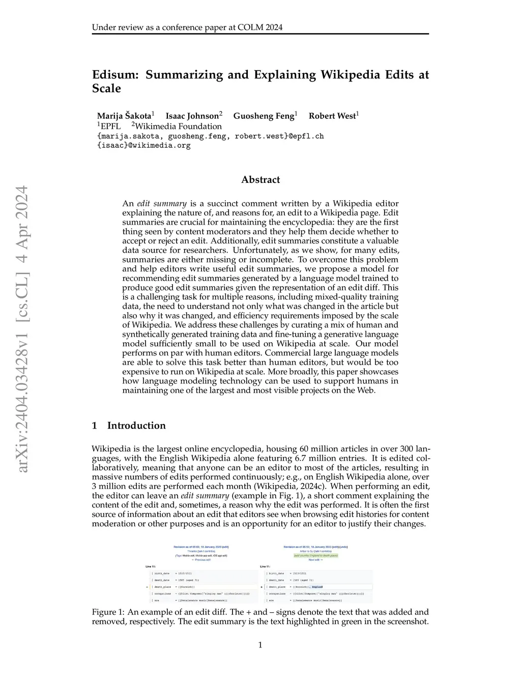 Edisum: Summarizing and Explaining Wikipedia Edits at Scale