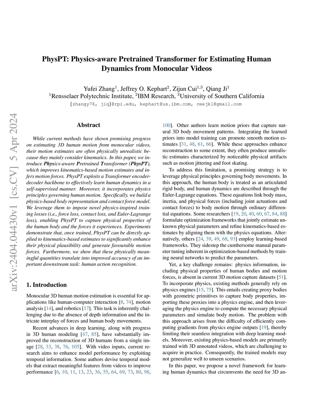 While current methods have shown promising progress on estimating 3D human motion from monocular videos, their motion estimates are often physically unrealistic because they mainly consider kinematics. In this paper, we introduce Physics-aware Pretrained Transformer (PhysPT), which improves kinematics-based motion estimates and infers motion forces. PhysPT exploits a Transformer encoder-decoder backbone to effectively learn human dynamics in a self-supervised manner. Moreover, it incorporates physics principles governing human motion. Specifically, we build a physics-based body representation and contact force model. We leverage them to impose novel physics-inspired training losses (i.e., force loss, contact loss, and Euler-Lagrange loss), enabling PhysPT to capture physical properties of the human body and the forces it experiences. Experiments demonstrate that, once trained, PhysPT can be directly applied to kinematics-based estimates to significantly enhance their physical plausibility and generate favourable motion forces. Furthermore, we show that these physically meaningful quantities translate into improved accuracy of an important downstream task: human action recognition.