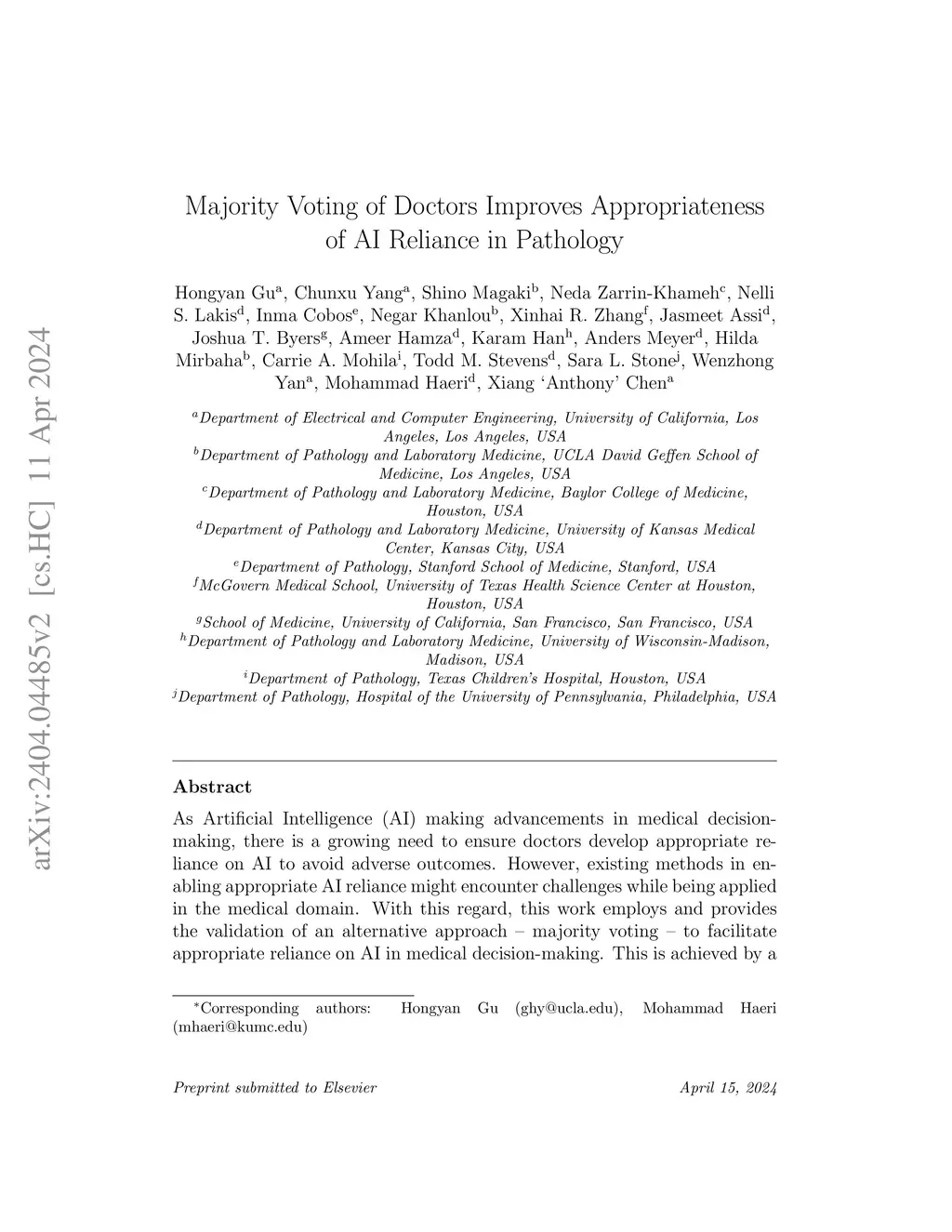 As Artificial Intelligence (AI) making advancements in medical decision-making, there is a growing need to ensure doctors develop appropriate reliance on AI to avoid adverse outcomes. However, existing methods in enabling appropriate AI reliance might encounter challenges while being applied in the medical domain. With this regard, this work employs and provides the validation of an alternative approach -- majority voting -- to facilitate appropriate reliance on AI in medical decision-making. This is achieved by a multi-institutional user study involving 32 medical professionals with various backgrounds, focusing on the pathology task of visually detecting a pattern, mitoses, in tumor images. Here, the majority voting process was conducted by synthesizing decisions under AI assistance from a group of pathology doctors (pathologists). Two metrics were used to evaluate the appropriateness of AI reliance: Relative AI Reliance (RAIR) and Relative Self-Reliance (RSR). Results showed that even with groups of three pathologists, majority-voted decisions significantly increased both RAIR and RSR -- by approximately 9% and 31%, respectively -- compared to decisions made by one pathologist collaborating with AI. This increased appropriateness resulted in better precision and recall in the detection of mitoses. While our study is centered on pathology, we believe these insights can be extended to general high-stakes decision-making processes involving similar visual tasks.