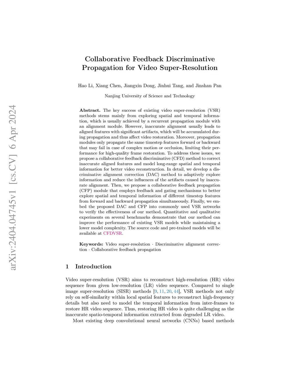 The key success of existing video super-resolution (VSR) methods stems mainly from exploring spatial and temporal information, which is usually achieved by a recurrent propagation module with an alignment module. However, inaccurate alignment usually leads to aligned features with significant artifacts, which will be accumulated during propagation and thus affect video restoration. Moreover, propagation modules only propagate the same timestep features forward or backward that may fail in case of complex motion or occlusion, limiting their performance for high-quality frame restoration. To address these issues, we propose a collaborative feedback discriminative (CFD) method to correct inaccurate aligned features and model long -range spatial and temporal information for better video reconstruction. In detail, we develop a discriminative alignment correction (DAC) method to adaptively explore information and reduce the influences of the artifacts caused by inaccurate alignment. Then, we propose a collaborative feedback propagation (CFP) module that employs feedback and gating mechanisms to better explore spatial and temporal information of different timestep features from forward and backward propagation simultaneously. Finally, we embed the proposed DAC and CFP into commonly used VSR networks to verify the effectiveness of our method. Quantitative and qualitative experiments on several benchmarks demonstrate that our method can improve the performance of existing VSR models while maintaining a lower model complexity. The source code and pre-trained models will be available at \url{https://github.com/House-Leo/CFDVSR}.