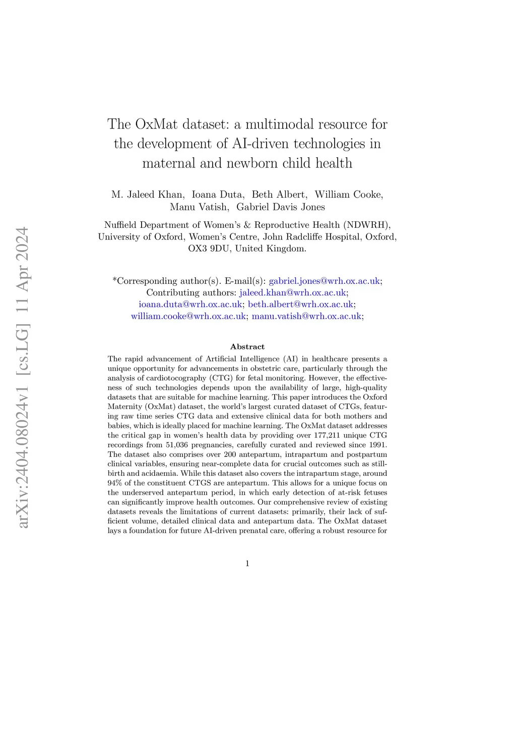 The rapid advancement of Artificial Intelligence (AI) in healthcare presents a unique opportunity for advancements in obstetric care, particularly through the analysis of cardiotocography (CTG) for fetal monitoring. However, the effectiveness of such technologies depends upon the availability of large, high-quality datasets that are suitable for machine learning. This paper introduces the Oxford Maternity (OxMat) dataset, the world's largest curated dataset of CTGs, featuring raw time series CTG data and extensive clinical data for both mothers and babies, which is ideally placed for machine learning. The OxMat dataset addresses the critical gap in women's health data by providing over 177,211 unique CTG recordings from 51,036 pregnancies, carefully curated and reviewed since 1991. The dataset also comprises over 200 antepartum, intrapartum and postpartum clinical variables, ensuring near-complete data for crucial outcomes such as stillbirth and acidaemia. While this dataset also covers the intrapartum stage, around 94% of the constituent CTGS are antepartum. This allows for a unique focus on the underserved antepartum period, in which early detection of at-risk fetuses can significantly improve health outcomes. Our comprehensive review of existing datasets reveals the limitations of current datasets: primarily, their lack of sufficient volume, detailed clinical data and antepartum data. The OxMat dataset lays a foundation for future AI-driven prenatal care, offering a robust resource for developing and testing algorithms aimed at improving maternal and fetal health outcomes.
