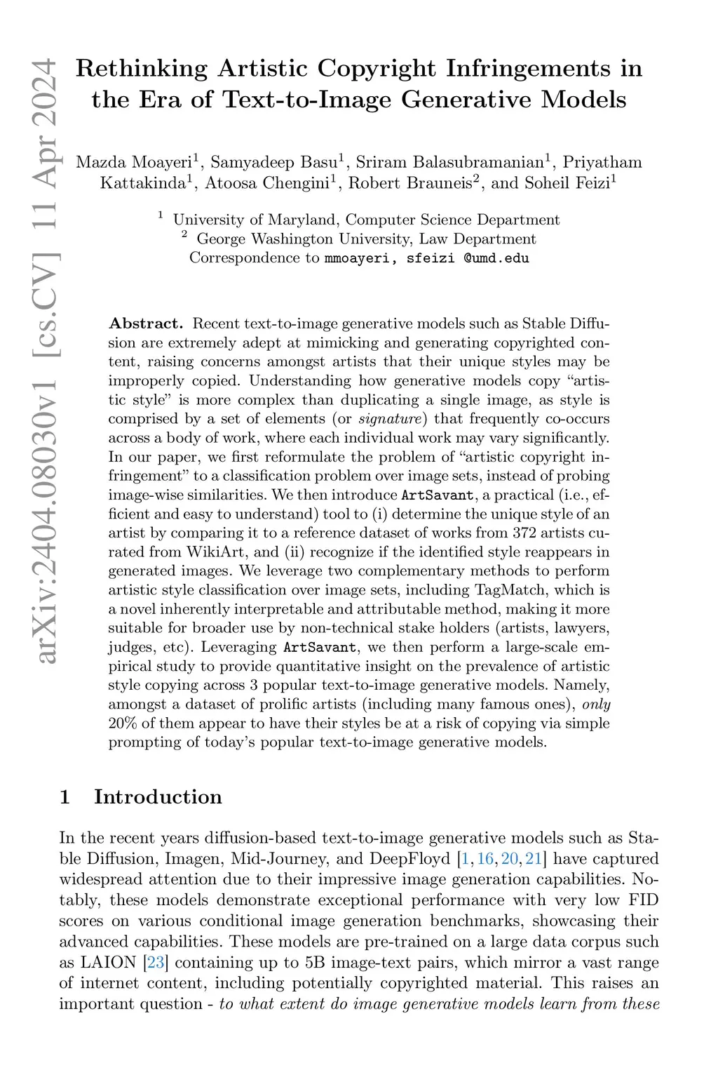 Recent text-to-image generative models such as Stable Diffusion are extremely adept at mimicking and generating copyrighted content, raising concerns amongst artists that their unique styles may be improperly copied. Understanding how generative models copy "artistic style" is more complex than duplicating a single image, as style is comprised by a set of elements (or signature) that frequently co-occurs across a body of work, where each individual work may vary significantly. In our paper, we first reformulate the problem of "artistic copyright infringement" to a classification problem over image sets, instead of probing image-wise similarities. We then introduce ArtSavant, a practical (i.e., efficient and easy to understand) tool to (i) determine the unique style of an artist by comparing it to a reference dataset of works from 372 artists curated from WikiArt, and (ii) recognize if the identified style reappears in generated images. We leverage two complementary methods to perform artistic style classification over image sets, includingTagMatch, which is a novel inherently interpretable and attributable method, making it more suitable for broader use by non-technical stake holders (artists, lawyers, judges, etc). Leveraging ArtSavant, we then perform a large-scale empirical study to provide quantitative insight on the prevalence of artistic style copying across 3 popular text-to-image generative models. Namely, amongst a dataset of prolific artists (including many famous ones), only 20% of them appear to have their styles be at a risk of copying via simple prompting of today's popular text-to-image generative models.