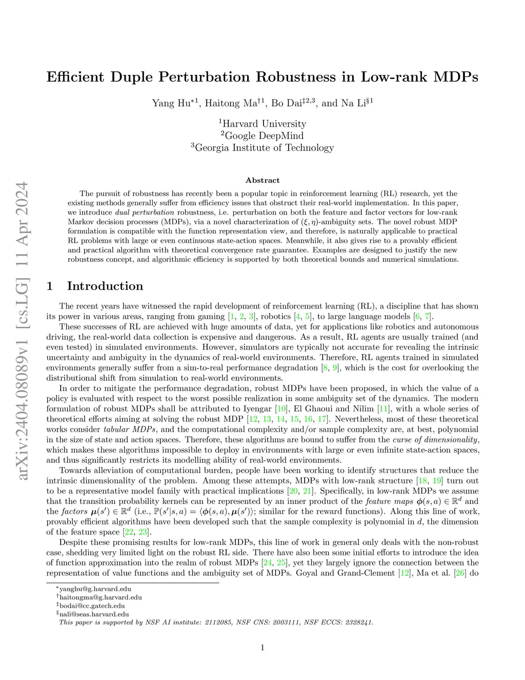 The pursuit of robustness has recently been a popular topic in reinforcement learning (RL) research, yet the existing methods generally suffer from efficiency issues that obstruct their real-world implementation. In this paper, we introduce duple perturbation robustness, i.e. perturbation on both the feature and factor vectors for low-rank Markov decision processes (MDPs), via a novel characterization of -ambiguity sets. The novel robust MDP formulation is compatible with the function representation view, and therefore, is naturally applicable to practical RL problems with large or even continuous state-action spaces. Meanwhile, it also gives rise to a provably efficient and practical algorithm with theoretical convergence rate guarantee. Examples are designed to justify the new robustness concept, and algorithmic efficiency is supported by both theoretical bounds and numerical simulations.
