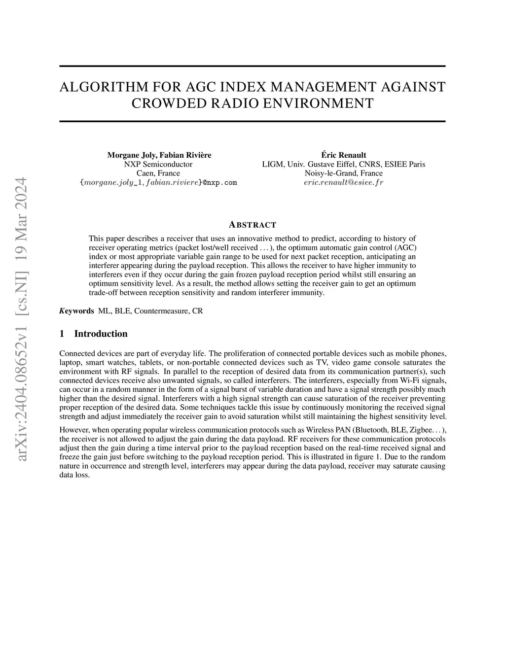 This paper describes a receiver that uses an innovative method to predict, according to history of receiver operating metrics (packet lost/well received), the optimum automatic gain control (AGC) index or most appropriate variable gain range to be used for next packet reception, anticipating an interferer appearing during the payload reception. This allows the receiver to have higher immunity to interferers even if they occur during the gain frozen payload reception period whilst still ensuring an optimum sensitivity level. As a result, the method allows setting the receiver gain to get an optimum trade-off between reception sensitivity and random interferer immunity.