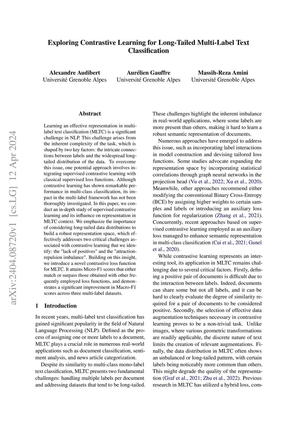Learning an effective representation in multi-label text classification (MLTC) is a significant challenge in NLP. This challenge arises from the inherent complexity of the task, which is shaped by two key factors: the intricate connections between labels and the widespread long-tailed distribution of the data. To overcome this issue, one potential approach involves integrating supervised contrastive learning with classical supervised loss functions. Although contrastive learning has shown remarkable performance in multi-class classification, its impact in the multi-label framework has not been thoroughly investigated. In this paper, we conduct an in-depth study of supervised contrastive learning and its influence on representation in MLTC context. We emphasize the importance of considering long-tailed data distributions to build a robust representation space, which effectively addresses two critical challenges associated with contrastive learning that we identify: the "lack of positives" and the "attraction-repulsion imbalance". Building on this insight, we introduce a novel contrastive loss function for MLTC. It attains Micro-F1 scores that either match or surpass those obtained with other frequently employed loss functions, and demonstrates a significant improvement in Macro-F1 scores across three multi-label datasets.