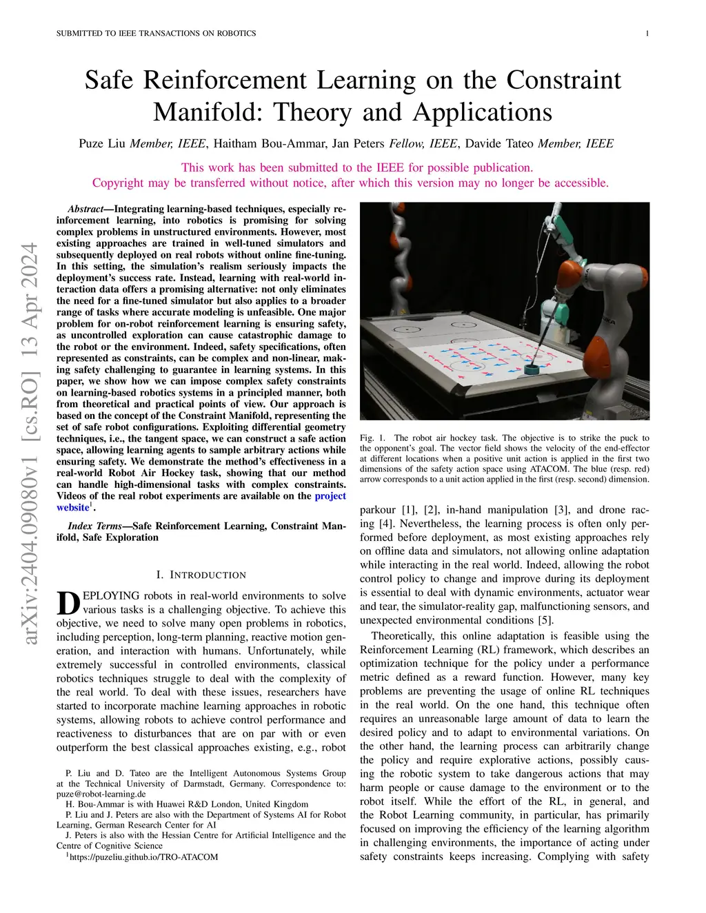 Integrating learning-based techniques, especially reinforcement learning, into robotics is promising for solving complex problems in unstructured environments. However, most existing approaches are trained in well-tuned simulators and subsequently deployed on real robots without online fine-tuning. In this setting, the simulation's realism seriously impacts the deployment's success rate. Instead, learning with real-world interaction data offers a promising alternative: not only eliminates the need for a fine-tuned simulator but also applies to a broader range of tasks where accurate modeling is unfeasible. One major problem for on-robot reinforcement learning is ensuring safety, as uncontrolled exploration can cause catastrophic damage to the robot or the environment. Indeed, safety specifications, often represented as constraints, can be complex and non-linear, making safety challenging to guarantee in learning systems. In this paper, we show how we can impose complex safety constraints on learning-based robotics systems in a principled manner, both from theoretical and practical points of view. Our approach is based on the concept of the Constraint Manifold, representing the set of safe robot configurations. Exploiting differential geometry techniques, i.e., the tangent space, we can construct a safe action space, allowing learning agents to sample arbitrary actions while ensuring safety. We demonstrate the method's effectiveness in a real-world Robot Air Hockey task, showing that our method can handle high-dimensional tasks with complex constraints. Videos of the real robot experiments are available on the project website (https://puzeliu.github.io/TRO-ATACOM).