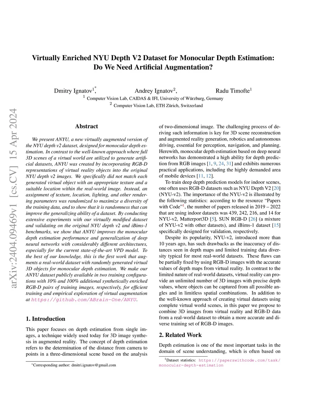 We present ANYU, a new virtually augmented version of the NYU depth v2 dataset, designed for monocular depth estimation. In contrast to the well-known approach where full 3D scenes of a virtual world are utilized to generate artificial datasets, ANYU was created by incorporating RGB-D representations of virtual reality objects into the original NYU depth v2 images. We specifically did not match each generated virtual object with an appropriate texture and a suitable location within the real-world image. Instead, an assignment of texture, location, lighting, and other rendering parameters was randomized to maximize a diversity of the training data, and to show that it is randomness that can improve the generalizing ability of a dataset. By conducting extensive experiments with our virtually modified dataset and validating on the original NYU depth v2 and iBims-1 benchmarks, we show that ANYU improves the monocular depth estimation performance and generalization of deep neural networks with considerably different architectures, especially for the current state-of-the-art VPD model. To the best of our knowledge, this is the first work that augments a real-world dataset with randomly generated virtual 3D objects for monocular depth estimation. We make our ANYU dataset publicly available in two training configurations with 10% and 100% additional synthetically enriched RGB-D pairs of training images, respectively, for efficient training and empirical exploration of virtual augmentation at https://github.com/ABrain-One/ANYU
