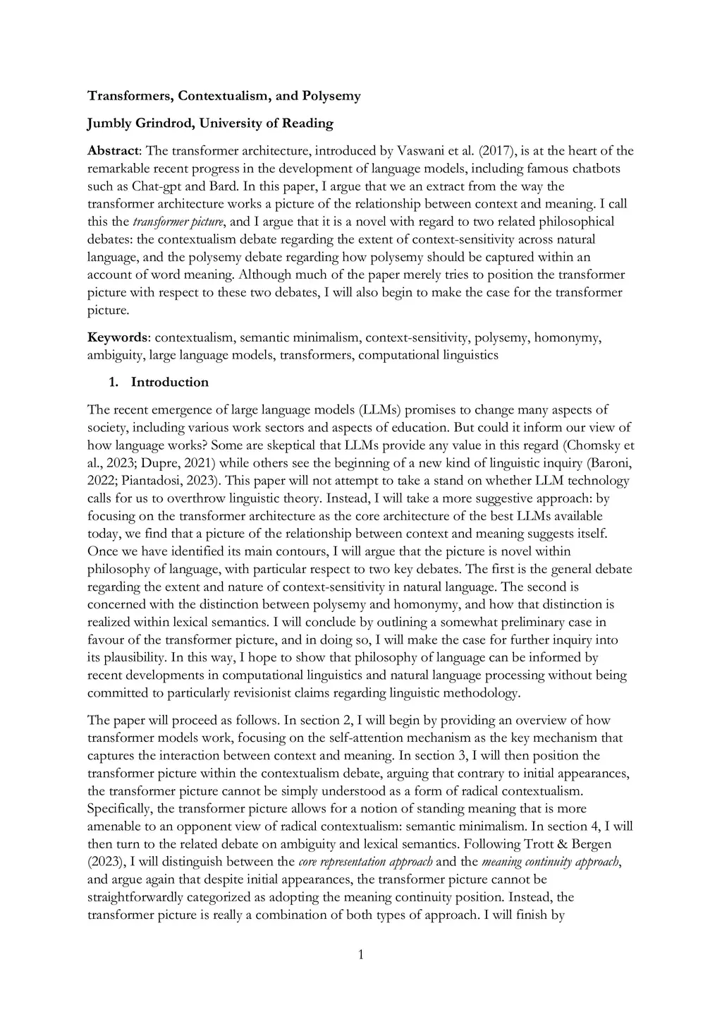 Transformers, Contextualism, and Polysemy