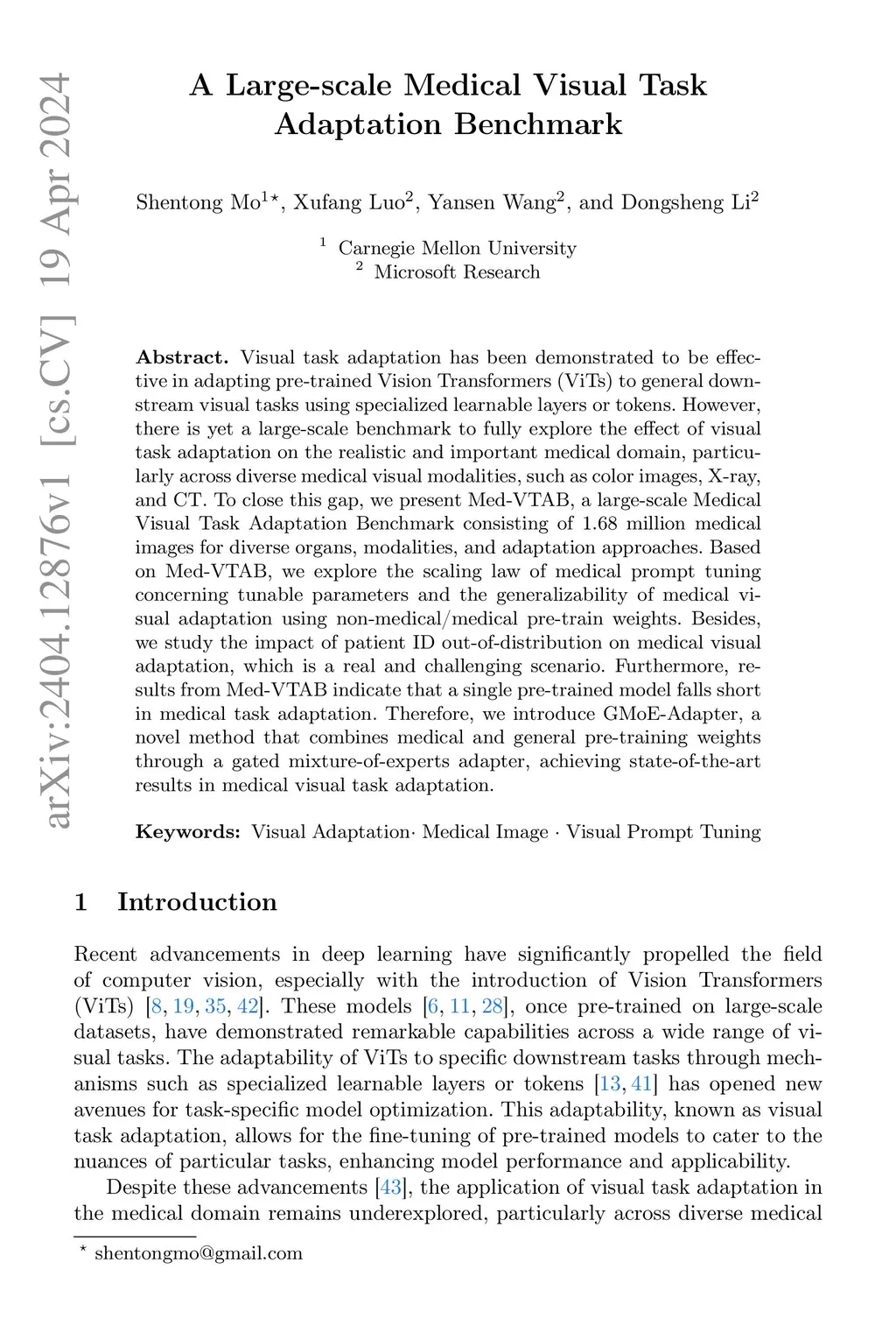 Visual task adaptation has been demonstrated to be effective in adapting pre-trained Vision Transformers (ViTs) to general downstream visual tasks using specialized learnable layers or tokens. However, there is yet a large-scale benchmark to fully explore the effect of visual task adaptation on the realistic and important medical domain, particularly across diverse medical visual modalities, such as color images, X-ray, and CT. To close this gap, we present Med-VTAB, a large-scale Medical Visual Task Adaptation Benchmark consisting of 1.68 million medical images for diverse organs, modalities, and adaptation approaches. Based on Med-VTAB, we explore the scaling law of medical prompt tuning concerning tunable parameters and the generalizability of medical visual adaptation using non-medical/medical pre-train weights. Besides, we study the impact of patient ID out-of-distribution on medical visual adaptation, which is a real and challenging scenario. Furthermore, results from Med-VTAB indicate that a single pre-trained model falls short in medical task adaptation. Therefore, we introduce GMoE-Adapter, a novel method that combines medical and general pre-training weights through a gated mixture-of-experts adapter, achieving state-of-the-art results in medical visual task adaptation.
