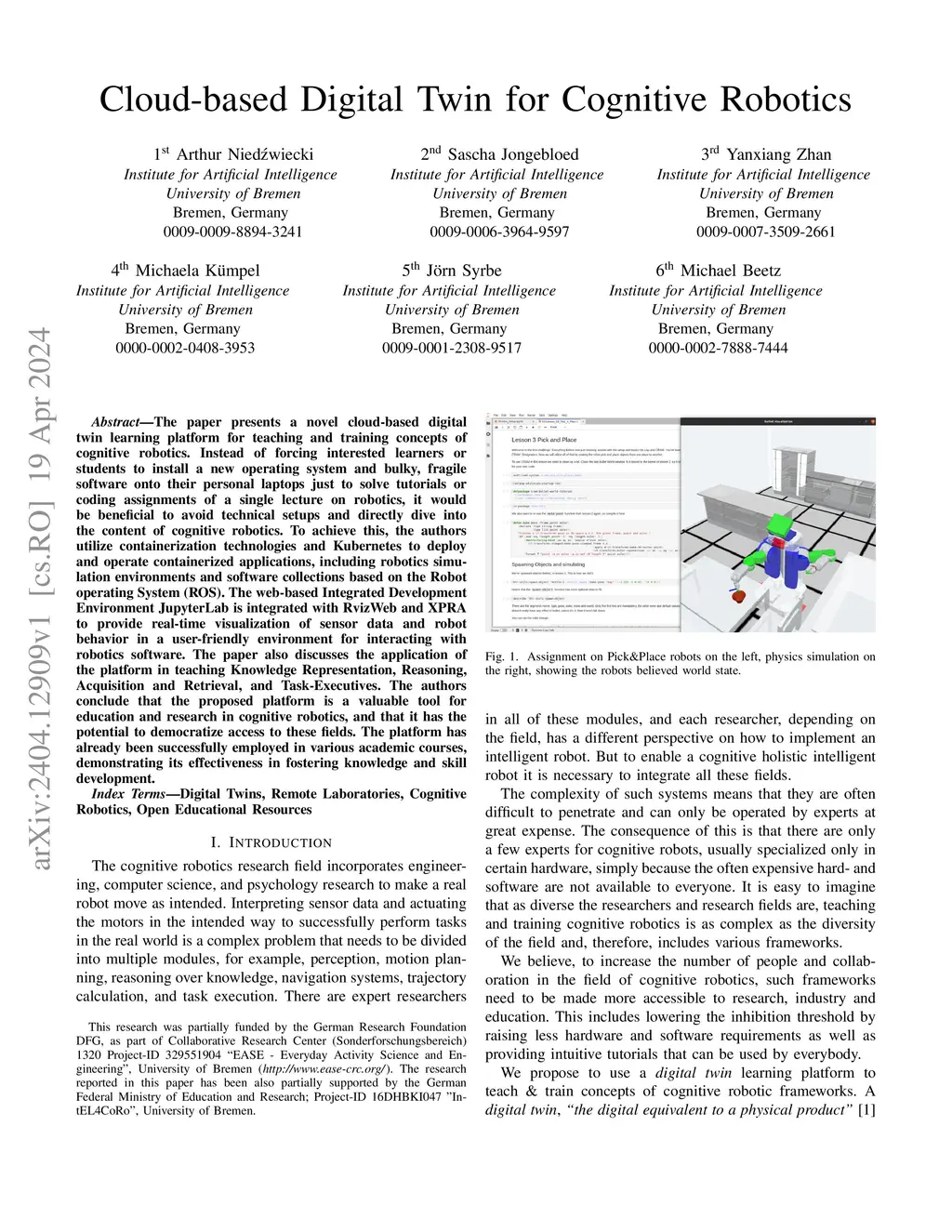The paper presents a novel cloud-based digital twin learning platform for teaching and training concepts of cognitive robotics. Instead of forcing interested learners or students to install a new operating system and bulky, fragile software onto their personal laptops just to solve tutorials or coding assignments of a single lecture on robotics, it would be beneficial to avoid technical setups and directly dive into the content of cognitive robotics. To achieve this, the authors utilize containerization technologies and Kubernetes to deploy and operate containerized applications, including robotics simulation environments and software collections based on the Robot operating System (ROS). The web-based Integrated Development Environment JupyterLab is integrated with RvizWeb and XPRA to provide real-time visualization of sensor data and robot behavior in a user-friendly environment for interacting with robotics software. The paper also discusses the application of the platform in teaching Knowledge Representation, Reasoning, Acquisition and Retrieval, and Task-Executives. The authors conclude that the proposed platform is a valuable tool for education and research in cognitive robotics, and that it has the potential to democratize access to these fields. The platform has already been successfully employed in various academic courses, demonstrating its effectiveness in fostering knowledge and skill development.