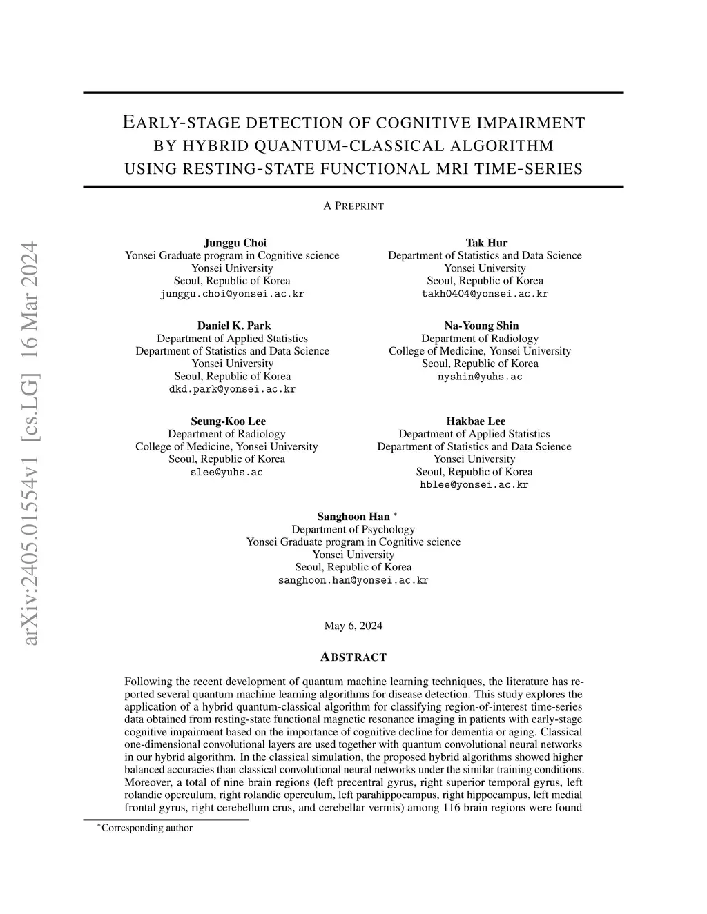 Following the recent development of quantum machine learning techniques, the literature has reported several quantum machine learning algorithms for disease detection. This study explores the application of a hybrid quantum-classical algorithm for classifying region-of-interest time-series data obtained from resting-state functional magnetic resonance imaging in patients with early-stage cognitive impairment based on the importance of cognitive decline for dementia or aging. Classical one-dimensional convolutional layers are used together with quantum convolutional neural networks in our hybrid algorithm. In the classical simulation, the proposed hybrid algorithms showed higher balanced accuracies than classical convolutional neural networks under the similar training conditions. Moreover, a total of nine brain regions (left precentral gyrus, right superior temporal gyrus, left rolandic operculum, right rolandic operculum, left parahippocampus, right hippocampus, left medial frontal gyrus, right cerebellum crus, and cerebellar vermis) among 116 brain regions were found to be relatively effective brain regions for the classification based on the model performances. The associations of the selected nine regions with cognitive decline, as found in previous studies, were additionally validated through seed-based functional connectivity analysis. We confirmed both the improvement of model performance with the quantum convolutional neural network and neuroscientific validities of brain regions from our hybrid quantum-classical model.