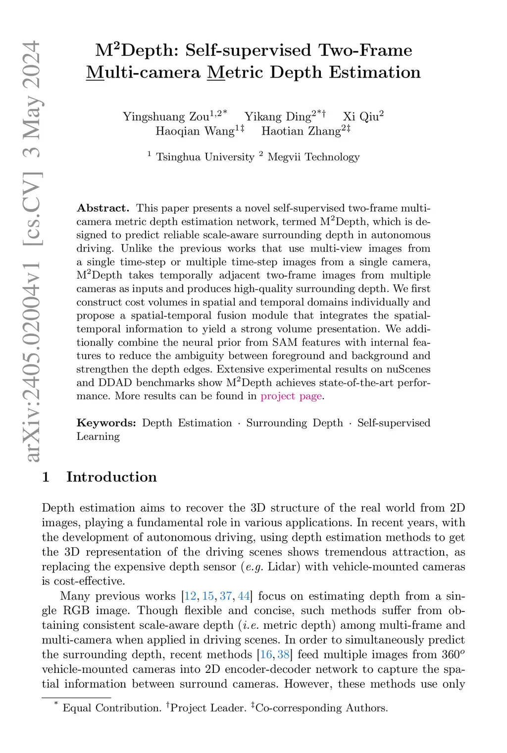 This paper presents a novel self-supervised two-frame multi-camera metric depth estimation network, termed MDepth, which is designed to predict reliable scale-aware surrounding depth in autonomous driving. Unlike the previous works that use multi-view images from a single time-step or multiple time-step images from a single camera, MDepth takes temporally adjacent two-frame images from multiple cameras as inputs and produces high-quality surrounding depth. We first construct cost volumes in spatial and temporal domains individually and propose a spatial-temporal fusion module that integrates the spatial-temporal information to yield a strong volume presentation. We additionally combine the neural prior from SAM features with internal features to reduce the ambiguity between foreground and background and strengthen the depth edges. Extensive experimental results on nuScenes and DDAD benchmarks show MDepth achieves state-of-the-art performance. More results can be found in https://heiheishuang.xyz/M2Depth .
