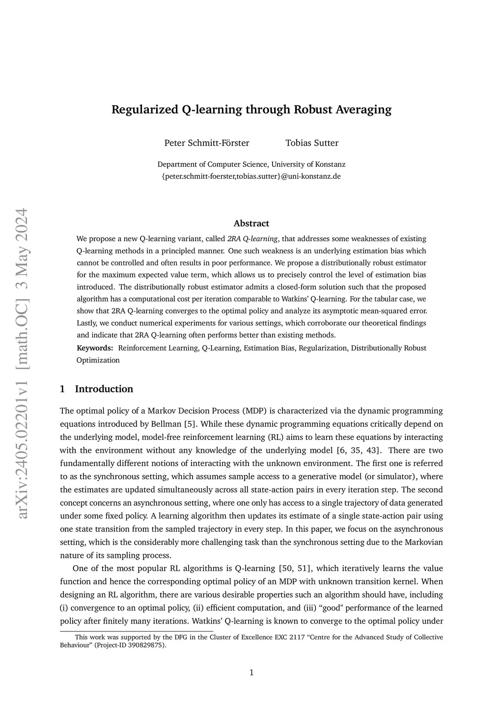 We propose a new Q-learning variant, called 2RA Q-learning, that addresses some weaknesses of existing Q-learning methods in a principled manner. One such weakness is an underlying estimation bias which cannot be controlled and often results in poor performance. We propose a distributionally robust estimator for the maximum expected value term, which allows us to precisely control the level of estimation bias introduced. The distributionally robust estimator admits a closed-form solution such that the proposed algorithm has a computational cost per iteration comparable to Watkins' Q-learning. For the tabular case, we show that 2RA Q-learning converges to the optimal policy and analyze its asymptotic mean-squared error. Lastly, we conduct numerical experiments for various settings, which corroborate our theoretical findings and indicate that 2RA Q-learning often performs better than existing methods.