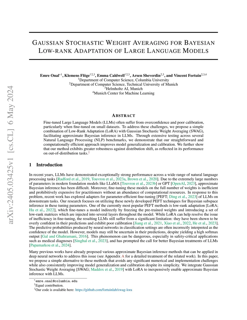 Fine-tuned Large Language Models (LLMs) often suffer from overconfidence and poor calibration, particularly when fine-tuned on small datasets. To address these challenges, we propose a simple combination of Low-Rank Adaptation (LoRA) with Gaussian Stochastic Weight Averaging (SWAG), facilitating approximate Bayesian inference in LLMs. Through extensive testing across several Natural Language Processing (NLP) benchmarks, we demonstrate that our straightforward and computationally efficient approach improves model generalization and calibration competitively with comparable, more sophisticated methods for Bayesian inference in LLMs. We further show that our method exhibits greater robustness against distribution shift, as reflected in its improved performance on out-of-distribution tasks.