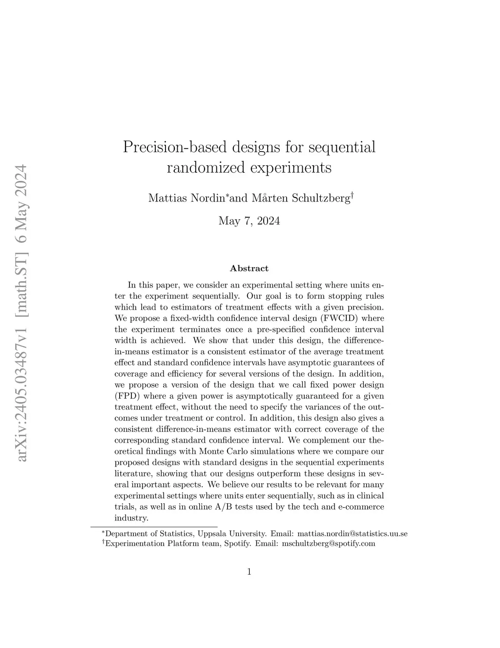 In this paper, we consider an experimental setting where units enter the experiment sequentially. Our goal is to form stopping rules which lead to estimators of treatment effects with a given precision. We propose a fixed-width confidence interval design (FWCID) where the experiment terminates once a pre-specified confidence interval width is achieved. We show that under this design, the difference-in-means estimator is a consistent estimator of the average treatment effect and standard confidence intervals have asymptotic guarantees of coverage and efficiency for several versions of the design. In addition, we propose a version of the design that we call fixed power design (FPD) where a given power is asymptotically guaranteed for a given treatment effect, without the need to specify the variances of the outcomes under treatment or control. In addition, this design also gives a consistent difference-in-means estimator with correct coverage of the corresponding standard confidence interval. We complement our theoretical findings with Monte Carlo simulations where we compare our proposed designs with standard designs in the sequential experiments literature, showing that our designs outperform these designs in several important aspects. We believe our results to be relevant for many experimental settings where units enter sequentially, such as in clinical trials, as well as in online A/B tests used by the tech and e-commerce industry.